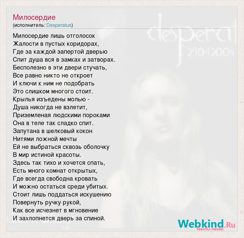 Милосердие лишь отголосок Жалости в пустых коридорах, Где за каждой запертой дверью Спит душа вся в замках и затворах. Бесполезно в эти двери стучать, Все равно никто не откроет И ключи к ним не подобрать Это слишком многого стоит. Крылья изъедены молью - Душа никогда не взлетит, Приземленая людскими пороками Она в теле так сладко спит. Запутана в шелковый кокон Нитями ложной мечты Ей не выбраться сквозь оболочку В мир истиной красоты. Здесь так тихо и хочется спать, Есть много комнат открытых, Где всегда свободна кровать И можно остаться среди убитых. Стоит лишь поддаться искушению Повернуть ручку рукой, Как все исчезнет в мгновение И захлопнется дверь за спиной.