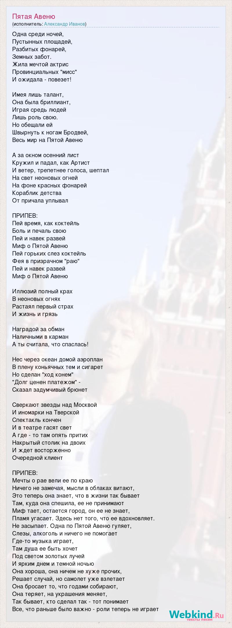 Одна среди ночей, Пустынных площадей, Разбитых фонарей, Земных забот. Жила мечтой актрис Провинциальных "мисс" И ожидала - повезет! Имея лишь талант, Она была бриллиант, Играя средь людей Лишь роль свою. Но обещали ей Швырнуть к ногам Бродвей, Весь мир на Пятой Авеню А за окном осенний лист Кружил и падал, как Артист И ветер, трепетнее голоса, шептал На свет неоновых огней На фоне красных фонарей Кораблик детства От причала уплывал ПРИПЕВ: Пей время, как коктейль Боль и печаль свою Пей и навек развей Миф о Пятой Авеню Пей горьких слез коктейль Фея в призрачном "раю" Пей и навек развей Миф о Пятой Авеню Иллюзий полный крах В неоновых огнях Растаял первый страх И жизнь и грязь Наградой за обман Наличными в карман А ты считала, что спаслась! Нес через океан домой аэроплан В плену коньячных тем и сигарет Но сделан "ход конем" "Долг ценен платежом" - Сказал задумчивый брюнет Сверкают звезды над Москвой И иномарки на Тверской Спектакль кончен И в театре гасят свет А где - то там опять притих Накрытый столик на двоих И ждет восторженно Очередной клиент ПРИПЕВ: Мечты о рае вели ее по краю Ничего не замечая, мысли в облаках витают, Это теперь она знает, что в жизни так бывает Там, куда она спешила, ее не принимают Миф тает, остается город, он ее не знает, Пламя угасает. Здесь нет того, что ее вдохновляет. Не засыпает. Одна по Пятой Авеню гуляет, Слезы, алкоголь и ничего не помогает Где-то музыка играет, Там душа ее быть хочет Под светом золотых лучей И ярким днем и темной ночью Она хороша, она ничем не хуже прочих, Решает случай, но самолет уже взлетает Она бросает то, что годами собирают, Она теряет, на украшения меняет, Так бывает, кто сделал так - тот понимает Все, что раньше было важно - роли теперь не играет