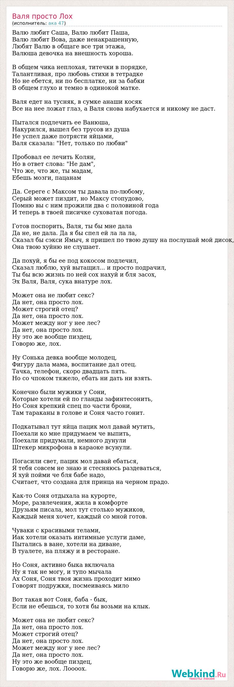 Валю любит Саша, Валю любит Паша, Валю любит Вова, даже ненакрашенную, Любят Валю в общаге все три этажа, Валюша девочка на внешность хороша. В общем чика неплохая, титечки в порядке, Талантливая, про любовь стихи в тетрадке Но не ебется, ни по бесплатке, ни за бабки В общем глухо и темно в одинокой матке. Валя едет на тусняк, в сумке анаши косяк Все на нее ложат глаз, а Валя снова набухается и никому не даст. Пытался подлечить ее Ванюша, Накурился, вышел без трусов из душа Не успел даже потрясти яйцами, Валя сказала: "Нет, только по любви" Пробовал ее лечить Колян, Но в ответ слова: "Не дам", Что же, что же, ты мадам, Ебешь мозги, пацанам Да. Сереге с Максом ты давала по-любому, Серый может пиздит, но Максу стопудово, Помню вы с ним прожили два с половиной года И теперь в твоей писичке суховатая погода. Готов поспорить, Валя, ты бы мне дала Да не, не дала. Да я бы спел ей ла ла ла, Сказал бы сэкси Ямыч, я пришел по твою душу на послушай мой дисок, Она твою хуйню не слушает. Да похуй, я бы ее под кокосом подлечил, Сказал люблю, хуй вытащил... и просто подрачил, Ты бы всю жизнь по ней сох нахуй и бля засох, Эх Валя, Валя, сука внатуре лох. Может она не любит секс? Да нет, она просто лох. Может строгий отец? Да нет, она просто лох. Может между ног у нее лес? Да нет, она просто лох. Ну это же вообще пиздец, Говорю же, лох. Ну Сонька девка вообще молодец, Фигуру дала мама, воспитание дал отец. Тачка, телефон, скоро двадцать пять. Но со чпоком тяжело, ебать ни дать ни взять. Конечно были мужики у Сони, Которые хотели ей по гланды зафинтесонить, Но Соня крепкий спец по части брони, Там тараканы в голове и Соня часто гонит. Подкатывал тут яйца пацик мол давай мутить, Поехали ко мне придумаем че выпить, Поехали придумали, немного дунули Штекер микрофона в караоке всунули. Погасили свет, пацик мол давай ебаться, Я тебя совсем не знаю и стесняюсь раздеваться, Я хуй пойми че бля бабе надо, Считает, что создана для принца на черном прадо. Как-то Соня отдыхала на курорте, Море, развлечения, жила в комфорте Друзьям писала, мол тут столько мужиков, Каждый меня хочет, каждый со мной готов. Чуваки с красивыми телами, Иак хотели оказать интимные услуги даме, Пытались в ване, хотели на диване, В туалете, на пляжу и в ресторане. Но Соня, активно быка включала Ну я так не могу, и тупо мычала Ах Соня, Соня твоя жизнь проходит мимо Говорят подружки, посмеиваясь мило Вот такая вот Соня, баба - бык, Если не ебешься, то хотя бы возьми на клык. Может она не любит секс? Да нет, она просто лох. Может строгий отец? Да нет, она просто лох. Может между ног у нее лес? Да нет, она просто лох. Ну это же вообще пиздец, Говорю же, лох. Лоооох.