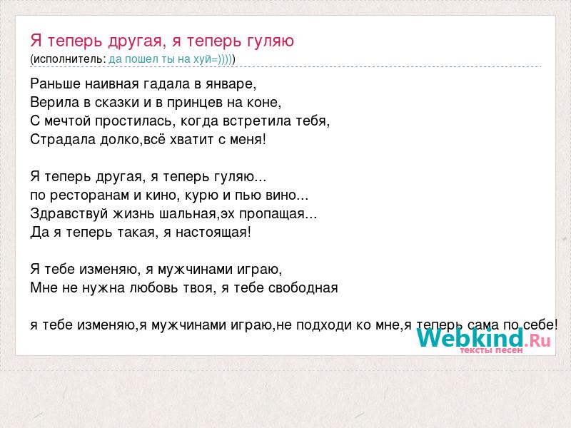Раньше наивная гадала в январе, Верила в сказки и в принцев на коне, С мечтой простилась, когда встретила тебя, Страдала долко,всё хватит с меня! Я теперь другая, я теперь гуляю... по ресторанам и кино, курю и пью вино... Здравствуй жизнь шальная,эх пропащая... Да я теперь такая, я настоящая! Я тебе изменяю, я мужчинами играю, Мне не нужна любовь твоя, я тебе свободная я тебе изменяю,я мужчинами играю,не подходи ко мне,я теперь сама по себе!