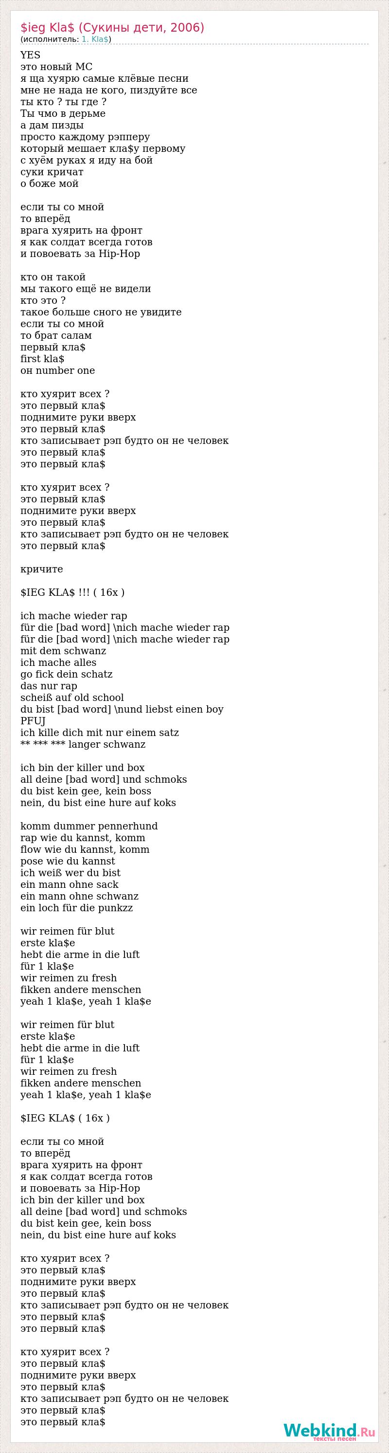 YES это новый MC я ща хуярю самые клёвые песни мне не нада не кого, пиздуйте все ты кто ? ты где ? Ты чмо в дерьме а дам пизды просто каждому рэпперу который мешает кла$у первому с хуём руках я иду на бой суки кричат о боже мой если ты со мной то вперёд врага хуярить на фронт я как солдат всегда готов и повоевать за Hip-Hop кто он такой мы такого ещё не видели кто это ? такое больше сного не увидите если ты со мной то брат салам первый кла$ first kla$ он number one кто хуярит всех ? это первый кла$ поднимите руки вверх это первый кла$ кто записывает рэп будто он не человек это первый кла$ это первый кла$ кто хуярит всех ? это первый кла$ поднимите руки вверх это первый кла$ кто записывает рэп будто он не человек это первый кла$ кричите $IEG KLA$ !!! ( 16x ) ich mache wieder rap für die [bad word] \nich mache wieder rap für die [bad word] \nich mache wieder rap mit dem schwanz ich mache alles go fick dein schatz das nur rap scheiß auf old school du bist [bad word] \nund liebst einen boy PFUJ ich kille dich mit nur einem satz ** *** *** langer schwanz ich bin der killer und box all deine [bad word] und schmoks du bist kein gee, kein boss nein, du bist eine hure auf koks komm dummer pennerhund rap wie du kannst, komm flow wie du kannst, komm pose wie du kannst ich weiß wer du bist ein mann ohne sack ein mann ohne schwanz ein loch für die punkzz wir reimen für blut erste kla$e hebt die arme in die luft für 1 kla$e wir reimen zu fresh fikken andere menschen yeah 1 kla$e, yeah 1 kla$e wir reimen für blut erste kla$e hebt die arme in die luft für 1 kla$e wir reimen zu fresh fikken andere menschen yeah 1 kla$e, yeah 1 kla$e $IEG KLA$ ( 16x ) если ты со мной то вперёд врага хуярить на фронт я как солдат всегда готов и повоевать за Hip-Hop ich bin der killer und box all deine [bad word] und schmoks du bist kein gee, kein boss nein, du bist eine hure auf koks кто хуярит всех ? это первый кла$ поднимите руки вверх это первый кла$ кто записывает рэп будто он не человек это первый кла$ это первый кла$ кто хуярит всех ? это первый кла$ поднимите руки вверх это первый кла$ кто записывает рэп будто он не человек это первый кла$ это первый кла$