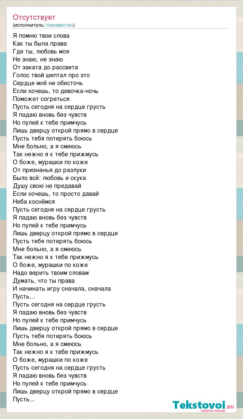 Я помню твои слова Как ты была права Где ты, любовь моя Не знаю, не знаю От заката до рассвета Голос твой шептал про это Сердце моё не обесточь Если хочешь, то девочка-ночь Поможет согреться Пусть сегодня на сердце грусть Я падаю вновь без чувств Но пулей к тебе примчусь Лишь дверцу открой прямо в сердце Пусть тебя потерять боюсь Мне больно, а я смеюсь Так нежно я к тебе прижмусь О боже, мурашки по коже От признанья до разлуки Было всё: любовь и скука Душу свою не предавай Если хочешь, то просто давай Неба коснёмся Пусть сегодня на сердце грусть Я падаю вновь без чувств Но пулей к тебе примчусь Лишь дверцу открой прямо в сердце Пусть тебя потерять боюсь Мне больно, а я смеюсь Так нежно я к тебе прижмусь О боже, мурашки по коже Надо верить твоим словам Думать, что ты права И начинать игру сначала, сначала Пусть... Пусть сегодня на сердце грусть Я падаю вновь без чувств Но пулей к тебе примчусь Лишь дверцу открой прямо в сердце Пусть тебя потерять боюсь Мне больно, а я смеюсь Так нежно я к тебе прижмусь О боже, мурашки по коже Пусть сегодня на сердце грусть Я падаю вновь без чувств Но пулей к тебе примчусь Лишь дверцу открой прямо в сердце Пусть...