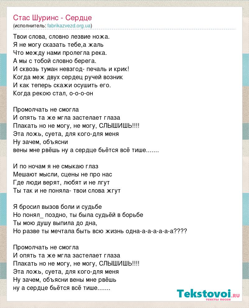 Твои слова, словно лезвие ножа. Я не могу сказать тебе,а жаль Что между нами пролегла река. А мы с тобой словно берега. И сквозь туман невзгод- печаль и крик! Когда меж двух сердец ручей возник И как теперь скажи осушить его. Когда рекою стал, о-о-о-он Промолчать не смогла И опять та же мгла застелает глаза Плакать но не могу, не могу, СЛЫШИШЬ!!!! Эта ложь, суета, для кого-для меня Ну зачем, объясни вены мне рвёшь ну а сердце бьётся всё тише....... И по ночам я не смыкаю глаз Мешают мысли, сцены не про нас Где люди верят, любят и не лгут Ты так и не поняла- твои слова жгут Я бросил вызов боли и судьбе Но понял_ поздно, ты была судьёй в борьбе Ты мою душу выпила до дна, Но разве ты мечтала быть всю жизнь одна-а-а-а-а-а-а???? Промолчать не смогла И опять та же мгла застелает глаза Плакать но не могу, не могу, СЛЫШИШЬ!!!! Эта ложь, суета, для кого-для меня Ну зачем, объясни вены мне рвёшь ну а сердце бьётся всё тише.......