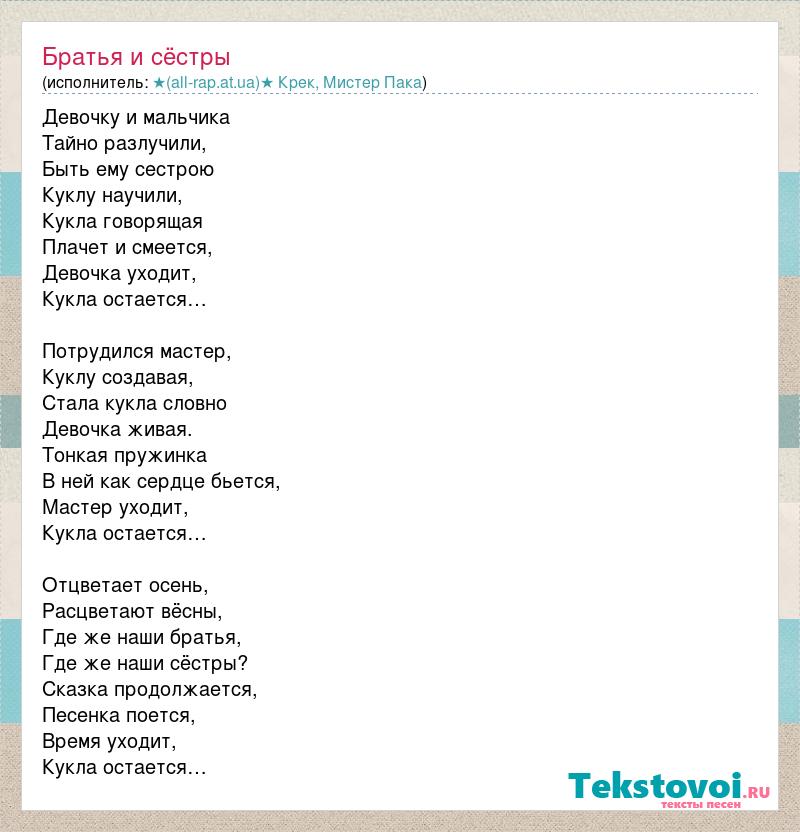 Девочку и мальчика Тайно разлучили, Быть ему сестрою Куклу научили, Кукла говорящая Плачет и смеется, Девочка уходит, Кукла остается… Потрудился мастер, Куклу создавая, Стала кукла словно Девочка живая. Тонкая пружинка В ней как сердце бьется, Мастер уходит, Кукла остается… Отцветает осень, Расцветают вёсны, Где же наши братья, Где же наши сёстры? Сказка продолжается, Песенка поется, Время уходит, Кукла остается…