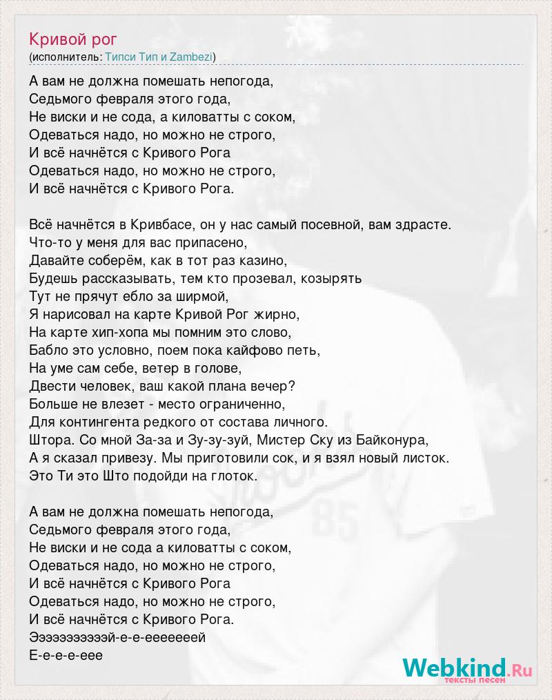 А вам не должна помешать непогода, Седьмого февраля этого года, Не виски и не сода, а киловатты с соком, Одеваться надо, но можно не строго, И всё начнётся с Кривого Рога Одеваться надо, но можно не строго, И всё начнётся с Кривого Рога. Всё начнётся в Кривбасе, он у нас самый посевной, вам здрасте. Что-то у меня для вас припасено, Давайте соберём, как в тот раз казино, Будешь рассказывать, тем кто прозевал, козырять Тут не прячут ебло за ширмой, Я нарисовал на карте Кривой Рог жирно, На карте хип-хопа мы помним это слово, Бабло это условно, поем пока кайфово петь, На уме сам себе, ветер в голове, Двести человек, ваш какой плана вечер? Больше не влезет - место ограниченно, Для контингента редкого от состава личного. Штора. Со мной За-за и Зу-зу-зуй, Мистер Ску из Байконура, А я сказал привезу. Мы приготовили сок, и я взял новый листок. Это Ти это Што подойди на глоток. А вам не должна помешать непогода, Седьмого февраля этого года, Не виски и не сода а киловатты с соком, Одеваться надо, но можно не строго, И всё начнётся с Кривого Рога Одеваться надо, но можно не строго, И всё начнётся с Кривого Рога. Эээээээээээй-е-е-ееееееей Е-е-е-е-еее