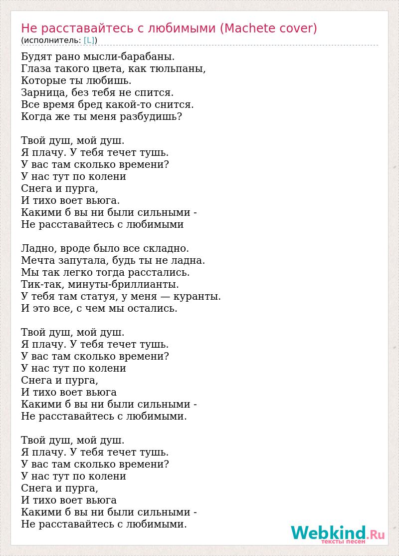 Будят рано мысли-барабаны. Глаза такого цвета, как тюльпаны, Которые ты любишь. Зарница, без тебя не спится. Все время бред какой-то снится. Когда же ты меня разбудишь? Твой душ, мой душ. Я плачу. У тебя течет тушь. У вас там сколько времени? У нас тут по колени Снега и пурга, И тихо воет вьюга. Какими б вы ни были сильными - Не расставайтесь с любимыми Ладно, вроде было все складно. Мечта запутала, будь ты не ладна. Мы так легко тогда расстались. Тик-так, минуты-бриллианты. У тебя там статуя, у меня — куранты. И это все, с чем мы остались. Твой душ, мой душ. Я плачу. У тебя течет тушь. У вас там сколько времени? У нас тут по колени Снега и пурга, И тихо воет вьюга Какими б вы ни были сильными - Не расставайтесь с любимыми. Твой душ, мой душ. Я плачу. У тебя течет тушь. У вас там сколько времени? У нас тут по колени Снега и пурга, И тихо воет вьюга Какими б вы ни были сильными - Не расставайтесь с любимыми.