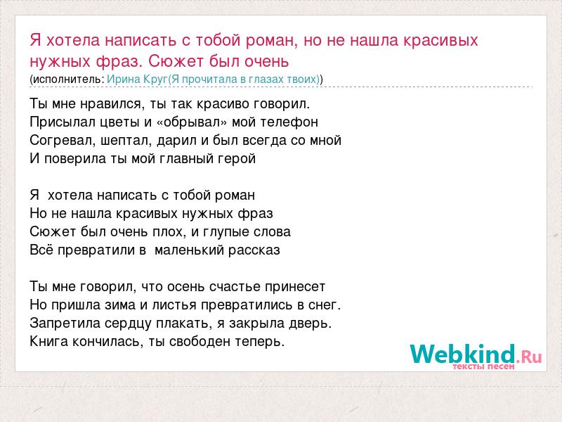 Главная→Исполнители→Ирина Круг(Я прочитала в глазах твоих)→Я хотела написать с тобой роман, но не нашла красивых нужных фраз. Сюжет был оч