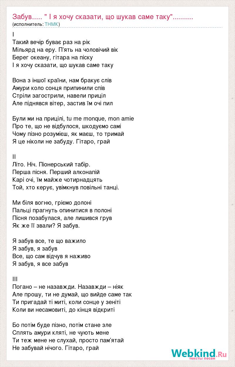 I Такий вечір буває раз на рік Мільярд на еру. П’ять на чоловічий вік Берег океану, гітара на піску І я хочу сказати, що шукав саме таку Вона з іншої країни, нам бракує слів Амури коло сонця припинили спів Стріли загострили, навели приціл Але піднявся вітер, застив їм очі пил Були ми на прицілі, tu me monque, mon amie Про те, що не відбулося, шкодуємо самі Чому пізно розумієш, як маєш, то тримай Я це ніколи не забуду. Гітаро, грай II Літо. Ніч. Піонерський табір. Перша пісня. Перший алконапій Карі очі, їм майже чотирнадцять Той, хто керує, увімкнув повільні танці. Ми біля вогню, гріємо долоні Пальці прагнуть опинитися в полоні Пісня позабулася, але лишився грув Як же її звали? Я забув. Я забув все, те що важило Я забув, я забув Все, що сам відчув я наживо Я забув, я все забув III Погано – не назавжди. Назавжди – ніяк Але прошу, ти не думай, що вийде саме так Ти пригадай ті миті, коли сонце у зеніті Коли ви несамовиті, до кінця відкриті Бо потім буде пізно, потім стане зле Сплять амури кляті, не чують мене Ти теж мене не слухай, просто пам’ятай Не забувай нічого. Гітаро, грай