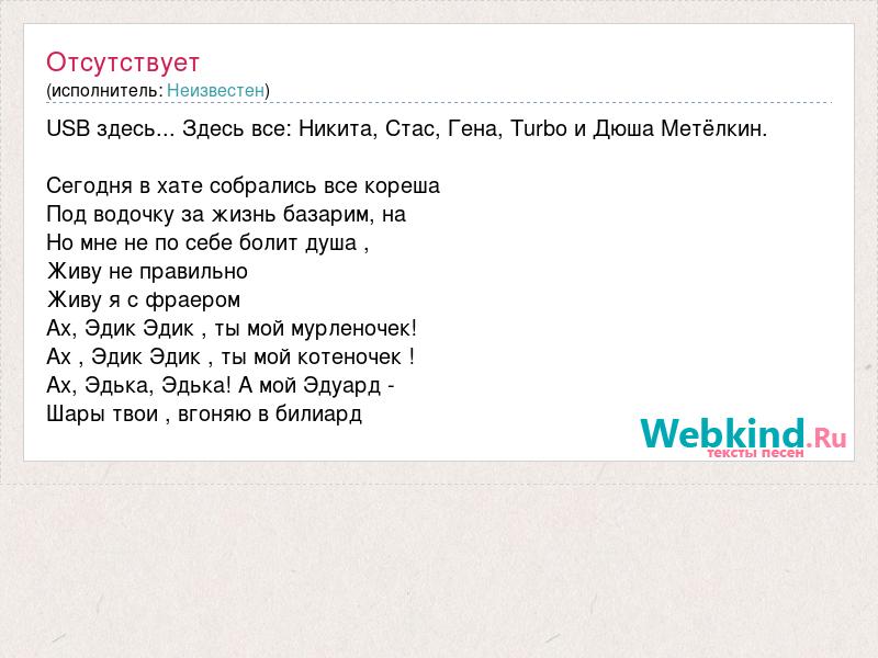 USB здесь... Здесь все: Никита, Стас, Гена, Turbo и Дюша Метёлкин. Сегодня в хате собрались все кореша Под водочку за жизнь базарим, на Но мне не по себе болит душа , Живу не правильно Живу я с фраером Ах, Эдик Эдик , ты мой мурленочек! Ах , Эдик Эдик , ты мой котеночек ! Ах, Эдька, Эдька! А мой Эдуард - Шары твои , вгоняю в билиард