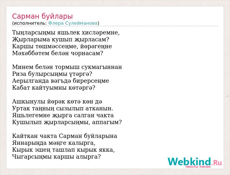 Тыңларсыңмы яшьлек хисләремне, Җырларыма кушып җырласам? Каршы төшмәссеңме, йөрәгеңне Мәхәббәтем белән чорнасам? Минем белән тормыш сукмагыннан Риза булырсыңмы үтәргә? Аерылганда вәгъдә бирерсеңме Кабат кайтуымны көтәргә? Ашкынулы йөрәк көтә көн дә Уртак таңның сызылып атканын. Яшьлегемне җырга салган чакта Кушылып җырларсыңмы, аппагым? Кайткан чакта Сарман буйларына Яннарыңда мәңге калырга, Кырык эшең ташлап кырык якка, Чыгарсыңмы каршы алырга?