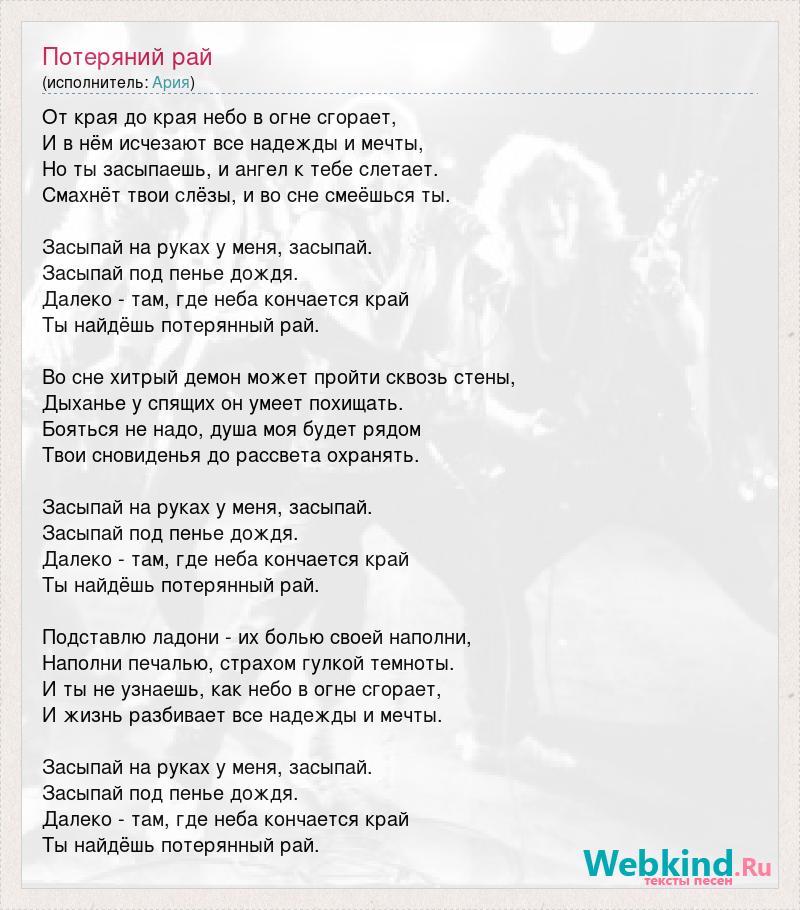 От края до края небо в огне сгорает, И в нём исчезают все надежды и мечты, Но ты засыпаешь, и ангел к тебе слетает. Смахнёт твои слёзы, и во сне смеёшься ты. Засыпай на руках у меня, засыпай. Засыпай под пенье дождя. Далеко - там, где неба кончается край Ты найдёшь потерянный рай. Во сне хитрый демон может пройти сквозь стены, Дыханье у спящих он умеет похищать. Бояться не надо, душа моя будет рядом Твои сновиденья до рассвета охранять. Засыпай на руках у меня, засыпай. Засыпай под пенье дождя. Далеко - там, где неба кончается край Ты найдёшь потерянный рай. Подставлю ладони - их болью своей наполни, Наполни печалью, страхом гулкой темноты. И ты не узнаешь, как небо в огне сгорает, И жизнь разбивает все надежды и мечты. Засыпай на руках у меня, засыпай. Засыпай под пенье дождя. Далеко - там, где неба кончается край Ты найдёшь потерянный рай.