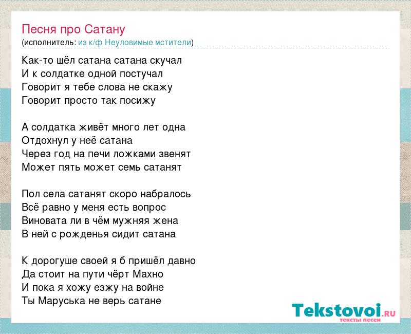 Как-то шёл сатана сатана скучал И к солдатке одной постучал Говорит я тебе слова не скажу Говорит просто так посижу А солдатка живёт много лет одна Отдохнул у неё сатана Через год на печи ложками звенят Может пять может семь сатанят Пол села сатанят скоро набралось Всё равно у меня есть вопрос Виновата ли в чём мужняя жена В ней с рожденья сидит сатана К дорогуше своей я б пришёл давно Да стоит на пути чёрт Махно И пока я хожу езжу на войне Ты Маруська не верь сатане