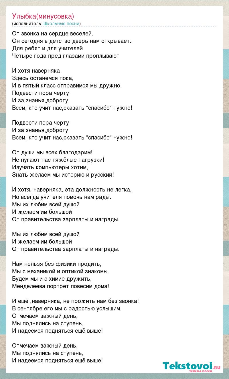 От звонка на сердце веселей. Он сегодня в детство дверь нам открывает. Для ребят и для учителей Четыре года пред глазами проплывают И хотя наверняка Здесь останемся пока, И в пятый класс отправимся мы дружно, Подвести пора черту И за знанья,доброту Всем, кто учит нас,сказать "спасибо" нужно! Подвести пора черту И за знанья,доброту Всем, кто учит нас,сказать "спасибо" нужно! От души мы всех благодарим! Не пугают нас тяжёлые нагрузки! Изучать компьютеры хотим, Знать желаем мы историю и русский! И хотя, наверняка, эта должность не легка, Но всегда учителя помочь нам рады. Мы их любим всей душой И желаем им большой От правительства зарплаты и награды. Мы их любим всей душой И желаем им большой От правительства зарплаты и награды. Нам нельзя без физики продить, Мы с механикой и оптикой знакомы. Будем мы и с химие дружить, Менделеева портрет повесим дома! И ещё ,наверняка, не прожить нам без звонка! В сентябре его мы с радостью услышим. Отмечаем важный день, Мы поднялись на ступень, И надеемся подняться ещё выше! Отмечаем важный день, Мы поднялись на ступень, И надеемся подняться ещё выше!