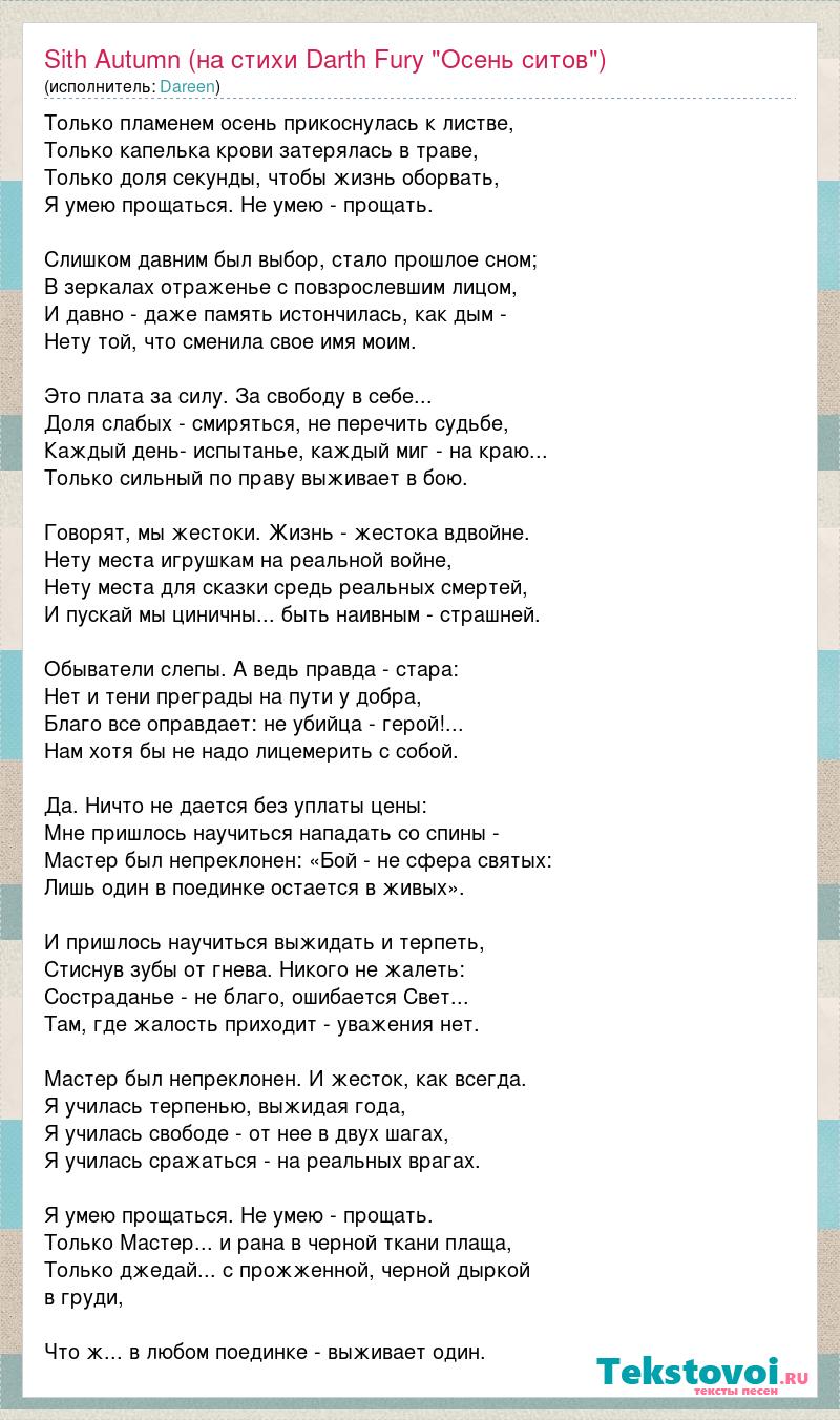 Только пламенем осень прикоснулась к листве, Только капелька крови затерялась в траве, Только доля секунды, чтобы жизнь оборвать, Я умею прощаться. Не умею - прощать. Слишком давним был выбор, стало прошлое сном; В зеркалах отраженье с повзрослевшим лицом, И давно - даже память истончилась, как дым - Нету той, что сменила свое имя моим. Это плата за силу. За свободу в себе... Доля слабых - смиряться, не перечить судьбе, Каждый день- испытанье, каждый миг - на краю... Только сильный по праву выживает в бою. Говорят, мы жестоки. Жизнь - жестока вдвойне. Нету места игрушкам на реальной войне, Нету места для сказки средь реальных смертей, И пускай мы циничны... быть наивным - страшней. Обыватели слепы. А ведь правда - стара: Нет и тени преграды на пути у добра, Благо все оправдает: не убийца - герой!... Нам хотя бы не надо лицемерить с собой. Да. Ничто не дается без уплаты цены: Мне пришлось научиться нападать со спины - Мастер был непреклонен: «Бой - не сфера святых: Лишь один в поединке остается в живых». И пришлось научиться выжидать и терпеть, Стиснув зубы от гнева. Никого не жалеть: Состраданье - не благо, ошибается Свет... Там, где жалость приходит - уважения нет. Мастер был непреклонен. И жесток, как всегда. Я училась терпенью, выжидая года, Я училась свободе - от нее в двух шагах, Я училась сражаться - на реальных врагах. Я умею прощаться. Не умею - прощать. Только Мастер... и рана в черной ткани плаща, Только джедай... с прожженной, черной дыркой в груди, Что ж... в любом поединке - выживает один.