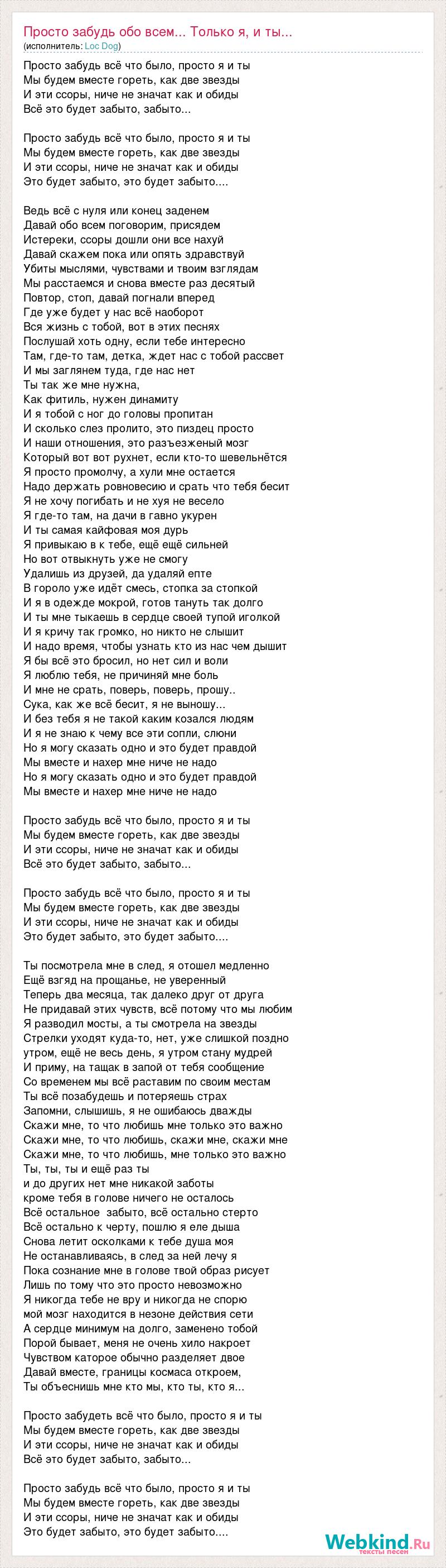 Просто забудь всё что было, просто я и ты Мы будем вместе гореть, как две звезды И эти ссоры, ниче не значат как и обиды Всё это будет забыто, забыто... Просто забудь всё что было, просто я и ты Мы будем вместе гореть, как две звезды И эти ссоры, ниче не значат как и обиды Это будет забыто, это будет забыто.... Ведь всё с нуля или конец заденем Давай обо всем поговорим, присядем Истереки, ссоры дошли они все нахуй Давай скажем пока или опять здравствуй Убиты мыслями, чувствами и твоим взглядам Мы расстаемся и снова вместе раз десятый Повтор, стоп, давай погнали вперед Где уже будет у нас всё наоборот Вся жизнь с тобой, вот в этих песнях Послушай хоть одну, если тебе интересно Там, где-то там, детка, ждет нас с тобой рассвет И мы заглянем туда, где нас нет Ты так же мне нужна, Как фитиль, нужен динамиту И я тобой с ног до головы пропитан И сколько слез пролито, это пиздец просто И наши отношения, это разъезженый мозг Который вот вот рухнет, если кто-то шевельнётся Я просто промолчу, а хули мне остается Надо держать ровновесию и срать что тебя бесит Я не хочу погибать и не хуя не весело Я где-то там, на дачи в гавно укурен И ты самая кайфовая моя дурь Я привыкаю в к тебе, ещё ещё сильней Но вот отвыкнуть уже не смогу Удалишь из друзей, да удаляй епте В гороло уже идёт смесь, стопка за стопкой И я в одежде мокрой, готов тануть так долго И ты мне тыкаешь в сердце своей тупой иголкой И я кричу так громко, но никто не слышит И надо время, чтобы узнать кто из нас чем дышит Я бы всё это бросил, но нет сил и воли Я люблю тебя, не причиняй мне боль И мне не срать, поверь, поверь, прошу.. Сука, как же всё бесит, я не выношу... И без тебя я не такой каким козался людям И я не знаю к чему все эти сопли, слюни Но я могу сказать одно и это будет правдой Мы вместе и нахер мне ниче не надо Но я могу сказать одно и это будет правдой Мы вместе и нахер мне ниче не надо Просто забудь всё что было, просто я и ты Мы будем вместе гореть, как две звезды И эти ссоры, ниче не значат как и обиды Всё это будет забыто, забыто... Просто забудь всё что было, просто я и ты Мы будем вместе гореть, как две звезды И эти ссоры, ниче не значат как и обиды Это будет забыто, это будет забыто.... Ты посмотрела мне в след, я отошел медленно Ещё взгяд на прощанье, не уверенный Теперь два месяца, так далеко друг от друга Не придавай этих чувств, всё потому что мы любим Я разводил мосты, а ты смотрела на звезды Стрелки уходят куда-то, нет, уже слишкой поздно утром, ещё не весь день, я утром стану мудрей И приму, на тащак в запой от тебя сообщение Со временем мы всё раставим по своим местам Ты всё позабудешь и потеряешь страх Запомни, слышишь, я не ошибаюсь дважды Скажи мне, то что любишь мне только это важно Скажи мне, то что любишь, скажи мне, скажи мне Скажи мне, то что любишь, мне только это важно Ты, ты, ты и ещё раз ты и до других нет мне никакой заботы кроме тебя в голове ничего не осталось Всё остальное забыто, всё остально стерто Всё остально к черту, пошлю я еле дыша Снова летит осколками к тебе душа моя Не останавливаясь, в след за ней лечу я Пока сознание мне в голове твой образ рисует Лишь по тому что это просто невозможно Я никогда тебе не вру и никогда не спорю мой мозг находится в незоне действия сети А сердце минимум на долго, заменено тобой Порой бывает, меня не очень хило накроет Чувством каторое обычно разделяет двое Давай вместе, г
