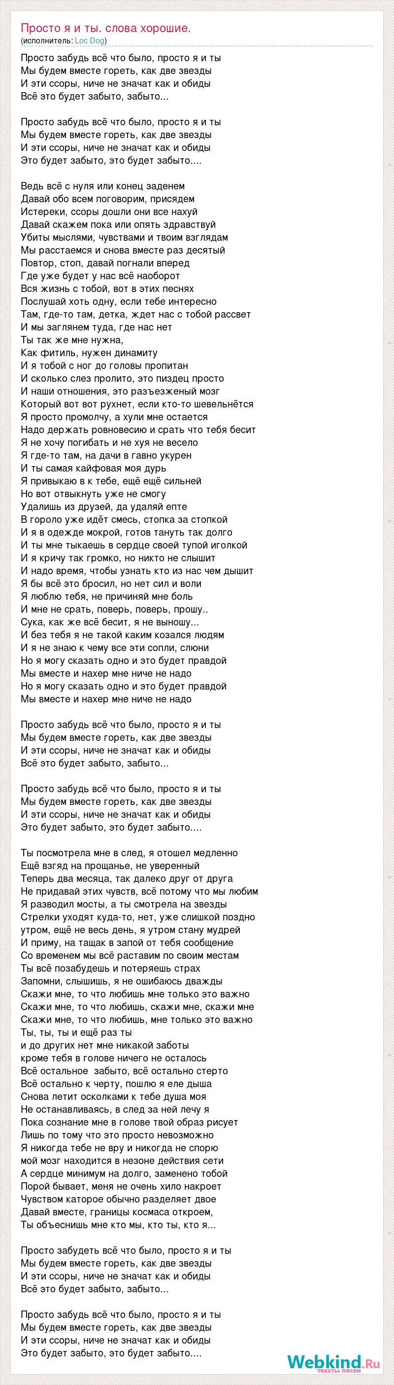 Просто забудь всё что было, просто я и ты Мы будем вместе гореть, как две звезды И эти ссоры, ниче не значат как и обиды Всё это будет забыто, забыто... Просто забудь всё что было, просто я и ты Мы будем вместе гореть, как две звезды И эти ссоры, ниче не значат как и обиды Это будет забыто, это будет забыто.... Ведь всё с нуля или конец заденем Давай обо всем поговорим, присядем Истереки, ссоры дошли они все нахуй Давай скажем пока или опять здравствуй Убиты мыслями, чувствами и твоим взглядам Мы расстаемся и снова вместе раз десятый Повтор, стоп, давай погнали вперед Где уже будет у нас всё наоборот Вся жизнь с тобой, вот в этих песнях Послушай хоть одну, если тебе интересно Там, где-то там, детка, ждет нас с тобой рассвет И мы заглянем туда, где нас нет Ты так же мне нужна, Как фитиль, нужен динамиту И я тобой с ног до головы пропитан И сколько слез пролито, это пиздец просто И наши отношения, это разъезженый мозг Который вот вот рухнет, если кто-то шевельнётся Я просто промолчу, а хули мне остается Надо держать ровновесию и срать что тебя бесит Я не хочу погибать и не хуя не весело Я где-то там, на дачи в гавно укурен И ты самая кайфовая моя дурь Я привыкаю в к тебе, ещё ещё сильней Но вот отвыкнуть уже не смогу Удалишь из друзей, да удаляй епте В гороло уже идёт смесь, стопка за стопкой И я в одежде мокрой, готов тануть так долго И ты мне тыкаешь в сердце своей тупой иголкой И я кричу так громко, но никто не слышит И надо время, чтобы узнать кто из нас чем дышит Я бы всё это бросил, но нет сил и воли Я люблю тебя, не причиняй мне боль И мне не срать, поверь, поверь, прошу.. Сука, как же всё бесит, я не выношу... И без тебя я не такой каким козался людям И я не знаю к чему все эти сопли, слюни Но я могу сказать одно и это будет правдой Мы вместе и нахер мне ниче не надо Но я могу сказать одно и это будет правдой Мы вместе и нахер мне ниче не надо Просто забудь всё что было, просто я и ты Мы будем вместе гореть, как две звезды И эти ссоры, ниче не значат как и обиды Всё это будет забыто, забыто... Просто забудь всё что было, просто я и ты Мы будем вместе гореть, как две звезды И эти ссоры, ниче не значат как и обиды Это будет забыто, это будет забыто.... Ты посмотрела мне в след, я отошел медленно Ещё взгяд на прощанье, не уверенный Теперь два месяца, так далеко друг от друга Не придавай этих чувств, всё потому что мы любим Я разводил мосты, а ты смотрела на звезды Стрелки уходят куда-то, нет, уже слишкой поздно утром, ещё не весь день, я утром стану мудрей И приму, на тащак в запой от тебя сообщение Со временем мы всё раставим по своим местам Ты всё позабудешь и потеряешь страх Запомни, слышишь, я не ошибаюсь дважды Скажи мне, то что любишь мне только это важно Скажи мне, то что любишь, скажи мне, скажи мне Скажи мне, то что любишь, мне только это важно Ты, ты, ты и ещё раз ты и до других нет мне никакой заботы кроме тебя в голове ничего не осталось Всё остальное забыто, всё остально стерто Всё остально к черту, пошлю я еле дыша Снова летит осколками к тебе душа моя Не останавливаясь, в след за ней лечу я Пока сознание мне в голове твой образ рисует Лишь по тому что это просто невозможно Я никогда тебе не вру и никогда не спорю мой мозг находится в незоне действия сети А сердце минимум на долго, заменено тобой Порой бывает, меня не очень хило накроет Чувством каторое обычно разделяет двое Давай вместе, г