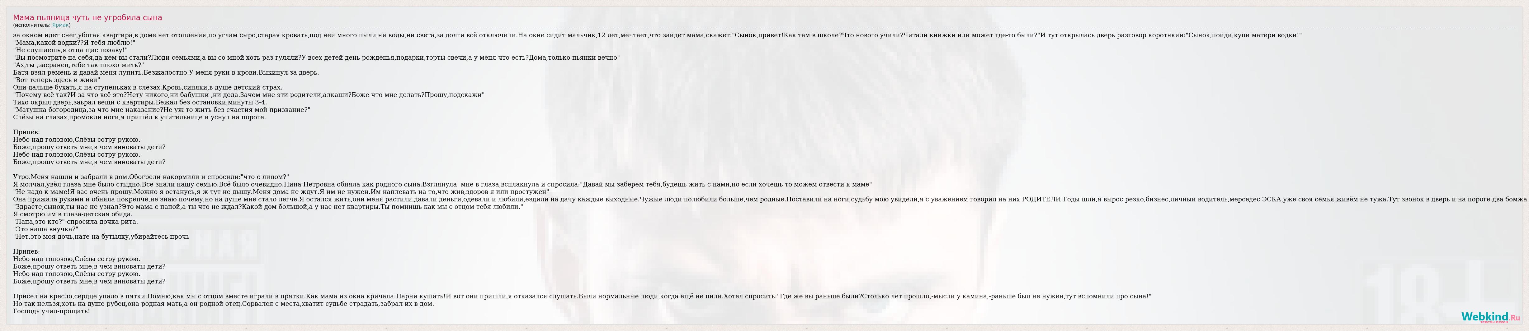 за окном идет снег,убогая квартира,в доме нет отопления,по углам сыро,старая кровать,под ней много пыли,ни воды,ни света,за долги всё отключили.На окне сидит мальчик,12 лет,мечтает,что зайдет мама,скажет:"Сынок,привет!Как там в школе?Что нового учили?Читали книжки или может где-то были?"И тут открылась дверь разговор коротнкий:"Сынок,пойди,купи матери водки!" "Мама,какой водки??Я тебя люблю!" "Не слушаешь,я отца щас позаву!" "Вы посмотрите на себя,да кем вы стали?Люди семьями,а вы со мной хоть раз гуляли?У всех детей день рожденья,подарки,торты свечи,а у меня что есть?Дома,только пьянки вечно" "Ах,ты ,засранец,тебе так плохо жить?" Батя взял ремень и давай меня лупить.Безжалостно.У меня руки в крови.Выкинул за дверь. "Вот теперь здесь и живи" Они дальше бухать,я на ступеньках в слезах.Кровь,синяки,в душе детский страх. "Почему всё так?И за что всё это?Нету никого,ни бабушки ,ни деда.Зачем мне эти родители,алкаши?Боже что мне делать?Прошу,подскажи" Тихо окрыл дверь,заьрал вещи с квартиры.Бежал без остановки,минуты 3-4. "Матушка богородица,за что мне наказание?Не уж то жить без счастия мой призвание?" Слёзы на глазах,промокли ноги,я пришёл к учительнице и уснул на пороге. Припев: Небо над головою,Слёзы сотру рукою. Боже,прошу ответь мне,в чем виноваты дети? Небо над головою,Слёзы сотру рукою. Боже,прошу ответь мне,в чем виноваты дети? Утро.Меня нашли и забрали в дом.Обогрели накормили и спросили:"что с лицом?" Я молчал,увёл глаза мне было стыдно.Все знали нашу семью.Всё было очевидно.Нина Петровна обняла как родного сына.Взглянула мне в глаза,всплакнула и спросила:"Давай мы заберем тебя,будешь жить с нами,но если хочешь то можем отвести к маме" "Не надо к маме!Я вас очень прошу.Можно я останусь,я ж тут не дышу.Меня дома не ждут.Я им не нужен.Им наплевать на то,что жив,здоров я или простужен" Она прижала руками и обняла покрепче,не знаю почему,но на душе мне стало легче.Я остался жить,они меня растили,давали деньги,одевали и любили,ездили на дачу каждые выходные.Чужые люди полюбили больше,чем родные.Поставили на ноги,судьбу мою увидели,я с уважением говорил на них РОДИТЕЛИ.Годы шли,я вырос резко,бизнес,личный водитель,мерседес ЭСКА,уже своя семья,живём не тужа.Тут звонок в дверь и на пороге два бомжа. "Здрасте,сынок,ты нас не узнал?Это мама с папой,а ты что не ждал?Какой дом большой,а у нас нет квартиры.Ты помнишь как мы с отцом тебя любили." Я смотрю им в глаза-детская обида. "Папа,это кто?"-спросила дочка рита. "Это наша внучка?" "Нет,это моя дочь,нате на бутылку,убирайтесь прочь Припев: Небо над головою,Слёзы сотру рукою. Боже,прошу ответь мне,в чем виноваты дети? Небо над головою,Слёзы сотру рукою. Боже,прошу ответь мне,в чем виноваты дети? Присел на кресло,сердце упало в пятки.Помню,как мы с отцом вместе играли в прятки.Как мама из окна кричала:Парни кушать!И вот они пришли,я отказался слушать.Были нормальные люди,когда ещё не пили.Хотел спросить:"Где же вы раньше были?Столько лет прошло,-мысли у камина,-раньше был не нужен,тут вспомнили про сына!" Но так нельзя,хоть на душе рубец,она-родная мать,а он-родной отец.Сорвался с места,хватит судьбе страдать,забрал их в дом. Господь учил-прощать!