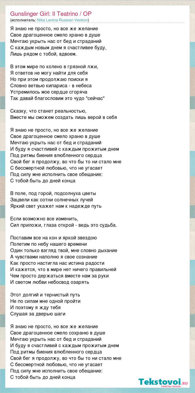 Я знаю не просто, но все же желание Свое драгоценное смело храню в душе Мечтаю укрыть нас от бед и страданий С каждым новым днем я счастливее буду, Лишь рядом с тобой, вдвоем. В этом мире по колено в грязной лжи, Я ответов не могу найти для себя Но при этом продолжаю поиски я Словно ветвью кипариса - в небеса Устремилось мое сердце сгоряча Так давай благословим это чудо "сейчас" Сказку, что станет реальностью, Вместе мы сможем создать лишь верой в себя Я знаю не просто, но все же желание Свое драгоценное смело храню в душе Мечтаю укрыть нас от бед и страданий И буду я счастливей с каждым прожитым днем Под ритмы биения влюбленного сердца Свой бег я продолжу, во что бы то ни стало мне С бессмертной любовью, что не угасает Под силу мне исполнить свое обещание: С тобой быть до дней конца В поле, под горой, подсолнуха цветы Зацвели как сотни солнечных лучей Яркий свет укажет нам к надежде путь Если возможно все изменить, Сил приложи, глаза открой - ведь это судьба. Поставим все на кон и яркой звездою Полетим по небу нашего времени Один только взгляд твой, мне словно дыхание А чувствами наполню я свое сознание Как просто настигла нас истина радости И кажется, что в мире нет ничего правильней Чем просто держаться вместе нам за руки И светом любви небосвод озарять Этот долгий и тернистый путь Не по силам мне одной пройти И поэтому я жду тебя Слушая за дверью шаги Я знаю не просто, но все же желание Свое драгоценное смело сохраню в душе Мечтаю укрыть нас от бед и страданий И буду я счастливей с каждым прожитым днем Под ритмы биения влюбленного сердца Свой бег я продолжу, во что бы то ни стало мне С бессмертной любовью, что не угасает Под силу мне исполнить свое обещание: С тобой быть до дней конца