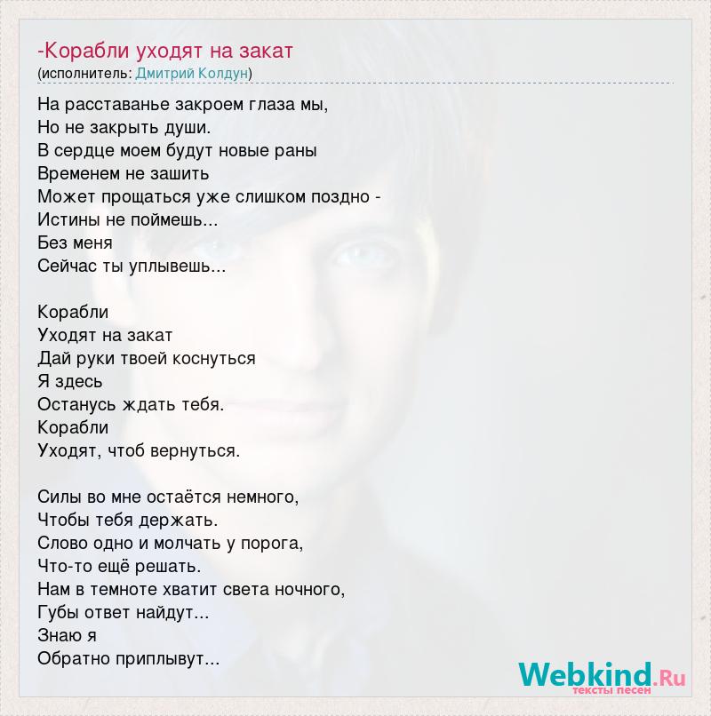 На расставанье закроем глаза мы, Но не закрыть души. В сердце моем будут новые раны Временем не зашить Может прощаться уже слишком поздно - Истины не поймешь... Без меня Сейчас ты уплывешь... Корабли Уходят на закат Дай руки твоей коснуться Я здесь Останусь ждать тебя. Корабли Уходят, чтоб вернуться. Силы во мне остаётся немного, Чтобы тебя держать. Слово одно и молчать у порога, Что-то ещё решать. Нам в темноте хватит света ночного, Губы ответ найдут... Знаю я Обратно приплывут...