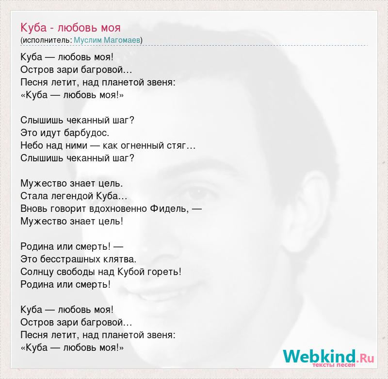 Куба — любовь моя! Остров зари багровой… Песня летит, над планетой звеня: «Куба — любовь моя!» Слышишь чеканный шаг? Это идут барбудос. Небо над ними — как огненный стяг… Слышишь чеканный шаг? Мужество знает цель. Стала легендой Куба… Вновь говорит вдохновенно Фидель, — Мужество знает цель! Родина или смерть! — Это бесстрашных клятва. Солнцу свободы над Кубой гореть! Родина или смерть! Куба — любовь моя! Остров зари багровой… Песня летит, над планетой звеня: «Куба — любовь моя!»