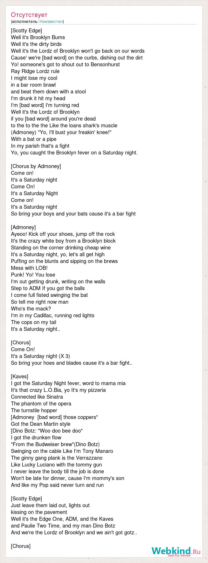 [Scotty Edge] Well it's Brooklyn Bums Well it's the dirty birds Well it's the Lordz of Brooklyn won't go back on our words Cause' we're [bad word] on the curbs, dishing out the dirt Yo! someone's got to shout out to Bensonhurst Ray Ridge Lordz rule I might lose my cool in a bar room brawl and beat them down with a stool I'm drunk it hit my head I'm [bad word] I'm turning red Well it's the Lordz of Brooklyn if you [bad word] around you're dead to the to the the Like the loans shark's muscle (Admoney) "Yo, I'll bust your freakin' knee!" With a bat or a pipe In my parish that's a fight Yo, you caught the Brooklyn fever on a Saturday night. [Chorus by Admoney] Come on! It's a Saturday night Come On! It's a Saturday Night Come on! It's a Saturday night So bring your boys and your bats cause it's a bar fight [Admoney] Ayeoo! Kick off your shoes, jump off the rock It's the crazy white boy from a Brooklyn block Standing on the corner drinking cheap wine It's a Saturday night, yo, let's all get high Puffing on the blunts and sipping on the brews Mess with LOB! Punk! Yo! You lose I'm out getting drunk, writing on the walls Step to ADM If you got the balls I come full fisted swinging the bat So tell me right now man Who's the mack? I'm in my Cadillac, running red lights The cops on my tail It's a Saturday night.. [Chorus] Come On! It's a Saturday night (X 3) So bring your hoes and blades cause it's a bar fight.. [Kaves] I got the Saturday Night fever, word to mama mia It's that crazy L.O.Bia, yo It's my pizzeria Connected like Sinatra The phantom of the opera The turnstile hopper [Admoney [bad word] those coppers" Got the Dean Martin style [Dino Botz: "Woo doo bee doo" I got the drunken flow "From the Budweiser brew"(Dino Botz) Swinging on the cable Like I'm Tony Manaro The ginny gang plank is the Verrazzano Like Lucky Luciano with the tommy gun I never leave the body till the job is done Won't be late for dinner, cause I'm mommy's son And like my Pop said never turn and run [Scotty Edge] Just leave them laid out, lights out kissing on the pavement Well it's the Edge One, ADM, and the Kaves and Paulie Two Time, and my man Dino Botz And we're the Lordz of Brooklyn and we ain't got gotz.. [Chorus]