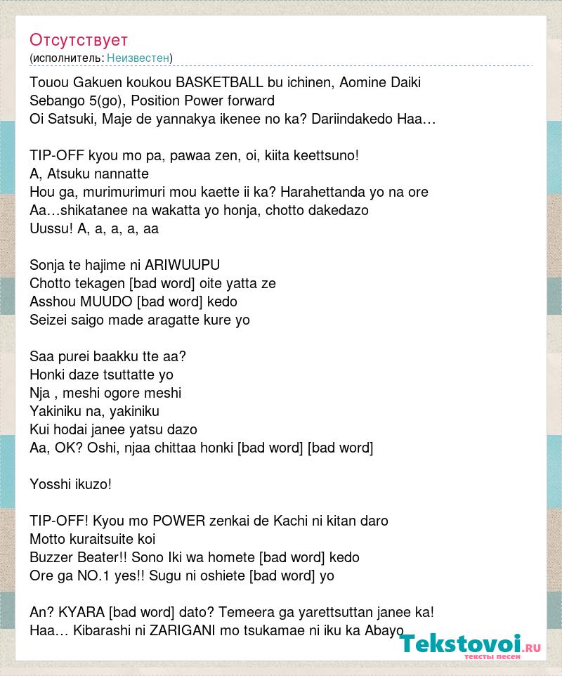 Touou Gakuen koukou BASKETBALL bu ichinen, Aomine Daiki Sebango 5(go), Position Power forward Oi Satsuki, Maje de yannakya ikenee no ka? Dariindakedo Haa… TIP-OFF kyou mo pa, pawaa zen, oi, kiita keettsuno! A, Atsuku nannatte Hou ga, murimurimuri mou kaette ii ka? Harahettanda yo na ore Aa…shikatanee na wakatta yo honja, chotto dakedazo Uussu! A, a, a, a, aa Sonja te hajime ni ARIWUUPU Chotto tekagen [bad word] oite yatta ze Asshou MUUDO warui kedo Seizei saigo made aragatte kure yo Saa purei baakku tte aa? Honki daze tsuttatte yo Nja , meshi ogore meshi Yakiniku na, yakiniku Kui hodai janee yatsu dazo Aa, OK? Oshi, njaa chittaa honki [bad word] yarukana Yosshi ikuzo! TIP-OFF! Kyou mo POWER zenkai de Kachi ni kitan daro Motto kuraitsuite koi Buzzer Beater!! Sono Iki wa homete yaru kedo Ore ga NO.1 yes!! Sugu ni oshiete yaru yo An? KYARA miushinatteru dato? Temeera ga yarettsuttan janee ka! Haa… Kibarashi ni ZARIGANI mo tsukamae ni iku ka Abayo