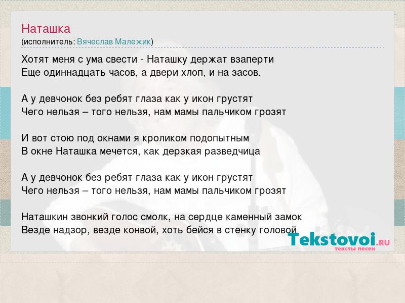 Хотят меня с ума свести - Наташку держат взаперти Еще одиннадцать часов, а двери хлоп, и на засов. А у девчонок без ребят глаза как у икон грустят Чего нельзя – того нельзя, нам мамы пальчиком грозят И вот стою под окнами я кроликом подопытным В окне Наташка мечется, как дерзкая разведчица А у девчонок без ребят глаза как у икон грустят Чего нельзя – того нельзя, нам мамы пальчиком грозят Наташкин звонкий голос смолк, на сердце каменный замок Везде надзор, везде конвой, хоть бейся в стенку головой