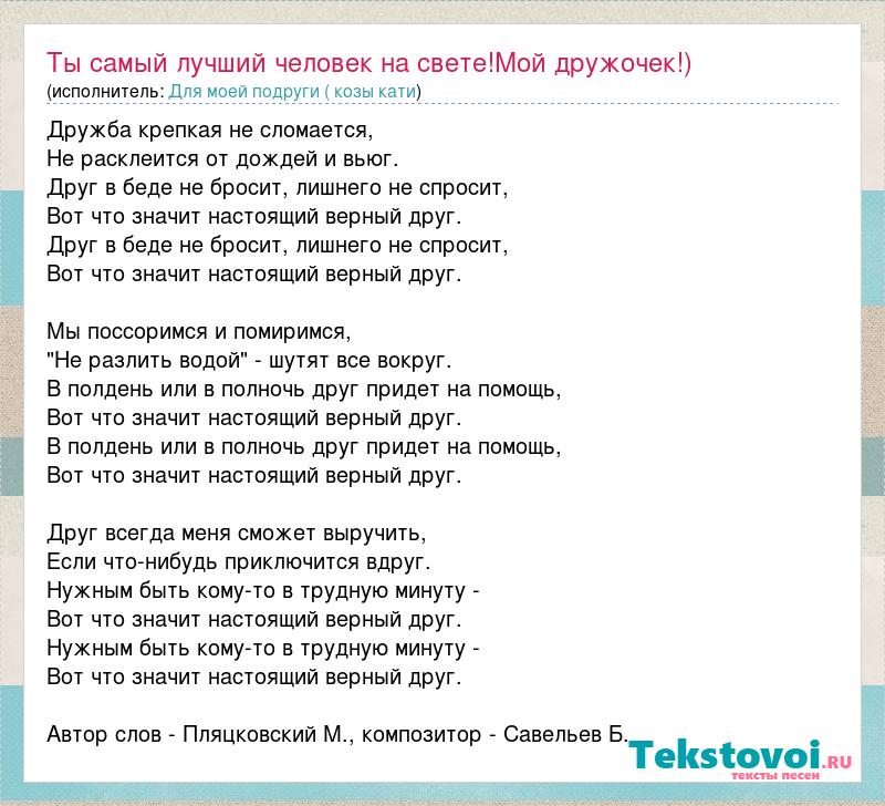 Дружба крепкая не сломается, Не расклеится от дождей и вьюг. Друг в беде не бросит, лишнего не спросит, Вот что значит настоящий верный друг. Друг в беде не бросит, лишнего не спросит, Вот что значит настоящий верный друг. Мы поссоримся и помиримся, "Не разлить водой" - шутят все вокруг. В полдень или в полночь друг придет на помощь, Вот что значит настоящий верный друг. В полдень или в полночь друг придет на помощь, Вот что значит настоящий верный друг. Друг всегда меня сможет выручить, Если что-нибудь приключится вдруг. Нужным быть кому-то в трудную минуту - Вот что значит настоящий верный друг. Нужным быть кому-то в трудную минуту - Вот что значит настоящий верный друг. Автор слов - Пляцковский М., композитор - Савельев Б.