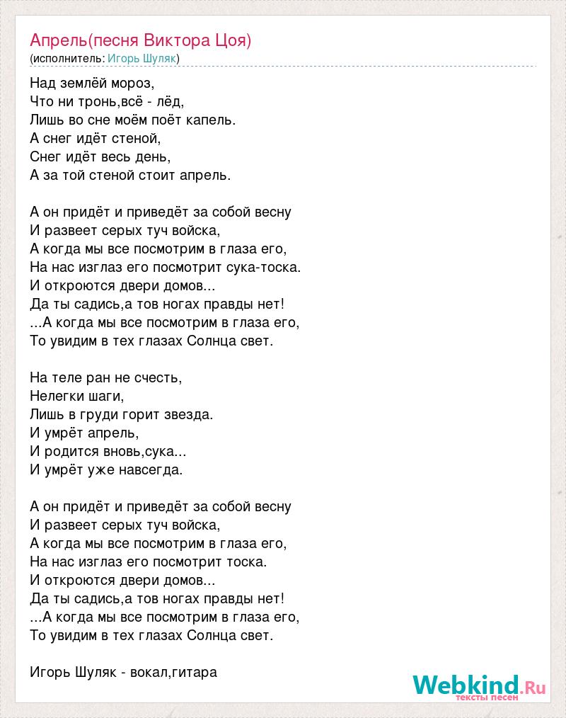 Над землёй мороз, Что ни тронь,всё - лёд, Лишь во сне моём поёт капель. А снег идёт стеной, Снег идёт весь день, А за той стеной стоит апрель. А он придёт и приведёт за собой весну И развеет серых туч войска, А когда мы все посмотрим в глаза его, На нас изглаз его посмотрит сука-тоска. И откроются двери домов... Да ты садись,а тов ногах правды нет! ...А когда мы все посмотрим в глаза его, То увидим в тех глазах Солнца свет. На теле ран не счесть, Нелегки шаги, Лишь в груди горит звезда. И умрёт апрель, И родится вновь,сука... И умрёт уже навсегда. А он придёт и приведёт за собой весну И развеет серых туч войска, А когда мы все посмотрим в глаза его, На нас изглаз его посмотрит тоска. И откроются двери домов... Да ты садись,а тов ногах правды нет! ...А когда мы все посмотрим в глаза его, То увидим в тех глазах Солнца свет. Игорь Шуляк - вокал,гитара