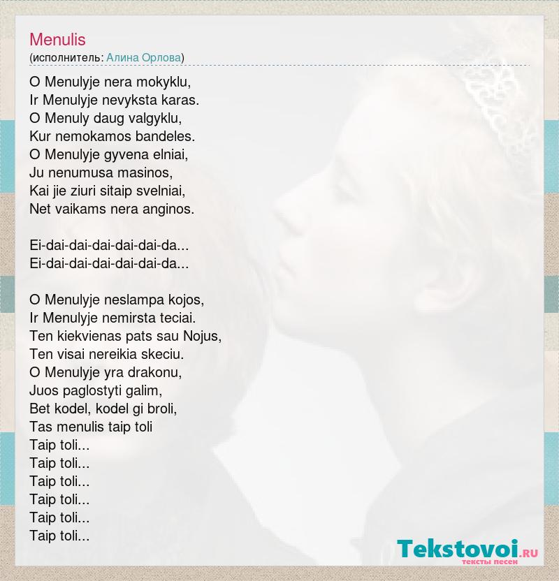 O Menulyje nera mokyklu, Ir Menulyje nevyksta karas. O Menuly daug valgyklu, Kur nemokamos bandeles. O Menulyje gyvena elniai, Ju nenumusa masinos, Kai jie ziuri sitaip svelniai, Net vaikams nera anginos. Ei-dai-dai-dai-dai-dai-da... Ei-dai-dai-dai-dai-dai-da... O Menulyje neslampa kojos, Ir Menulyje nemirsta teciai. Ten kiekvienas pats sau Nojus, Ten visai nereikia skeciu. O Menulyje yra drakonu, Juos paglostyti galim, Bet kodel, kodel gi broli, Tas menulis taip toli Taip toli... Taip toli... Taip toli... Taip toli... Taip toli... Taip toli...