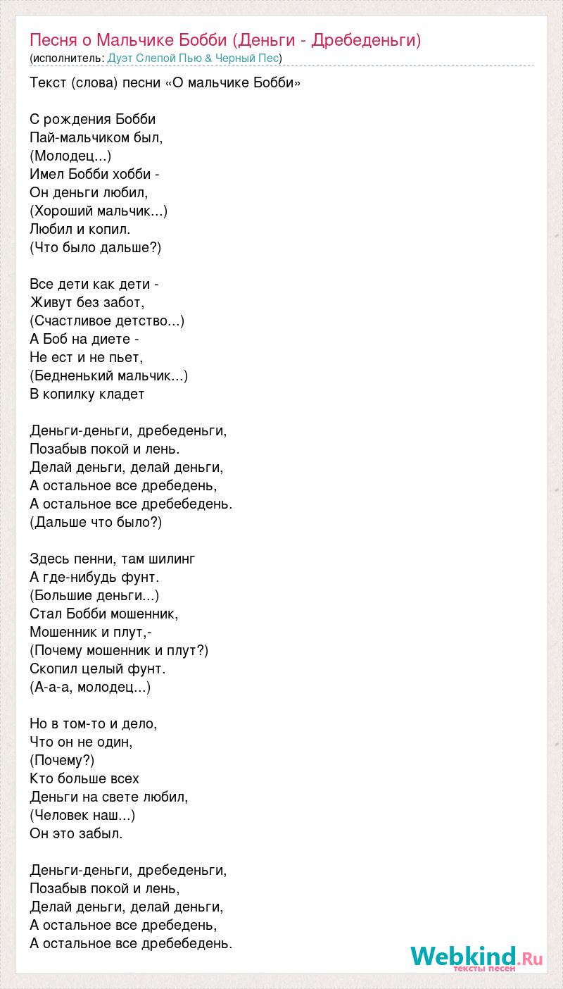 Текст (слова) песни «О мальчике Бобби» С рождения Бобби Пай-мальчиком был, (Молодец...) Имел Бобби хобби - Он деньги любил, (Хороший мальчик...) Любил и копил. (Что было дальше?) Все дети как дети - Живут без забот, (Счастливое детство...) А Боб на диете - Не ест и не пьет, (Бедненький мальчик...) В копилку кладет Деньги-деньги, дребеденьги, Позабыв покой и лень. Делай деньги, делай деньги, А остальное все дребедень, А остальное все дребебедень. (Дальше что было?) Здесь пенни, там шилинг А где-нибудь фунт. (Большие деньги...) Стал Бобби мошенник, Мошенник и плут,- (Почему мошенник и плут?) Скопил целый фунт. (А-а-а, молодец...) Но в том-то и дело, Что он не один, (Почему?) Кто больше всех Деньги на свете любил, (Человек наш...) Он это забыл. Деньги-деньги, дребеденьги, Позабыв покой и лень, Делай деньги, делай деньги, А остальное все дребедень, А остальное все дребебедень.