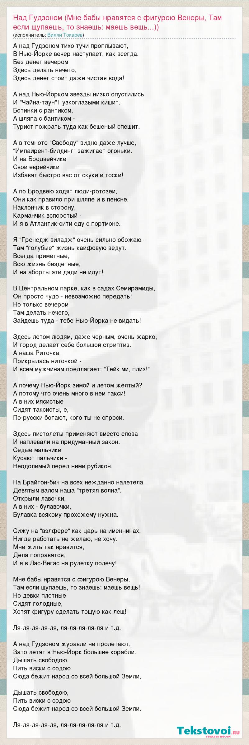 Главная→Исполнители→Вилли Токарев→Над Гудзоном (Мне бабы нравятся с фигурою Венеры, Там если щупаешь, то знае