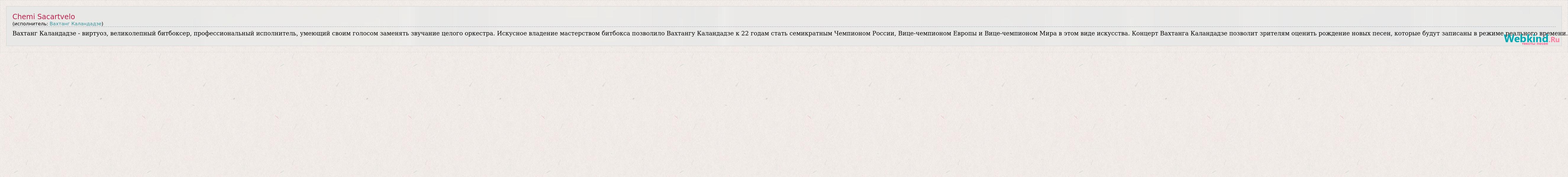 Вахтанг Каландадзе - виртуоз, великолепный битбоксер, профессиональный исполнитель, умеющий своим голосом заменять звучание целого оркестра. Искусное владение мастерством битбокса позволило Вахтангу Каландадзе к 22 годам стать семикратным Чемпионом России, Вице-чемпионом Европы и Вице-чемпионом Мира в этом виде искусства. Концерт Вахтанга Каландадзе позволит зрителям оценить рождение новых песен, которые будут записаны в режиме реального времени.