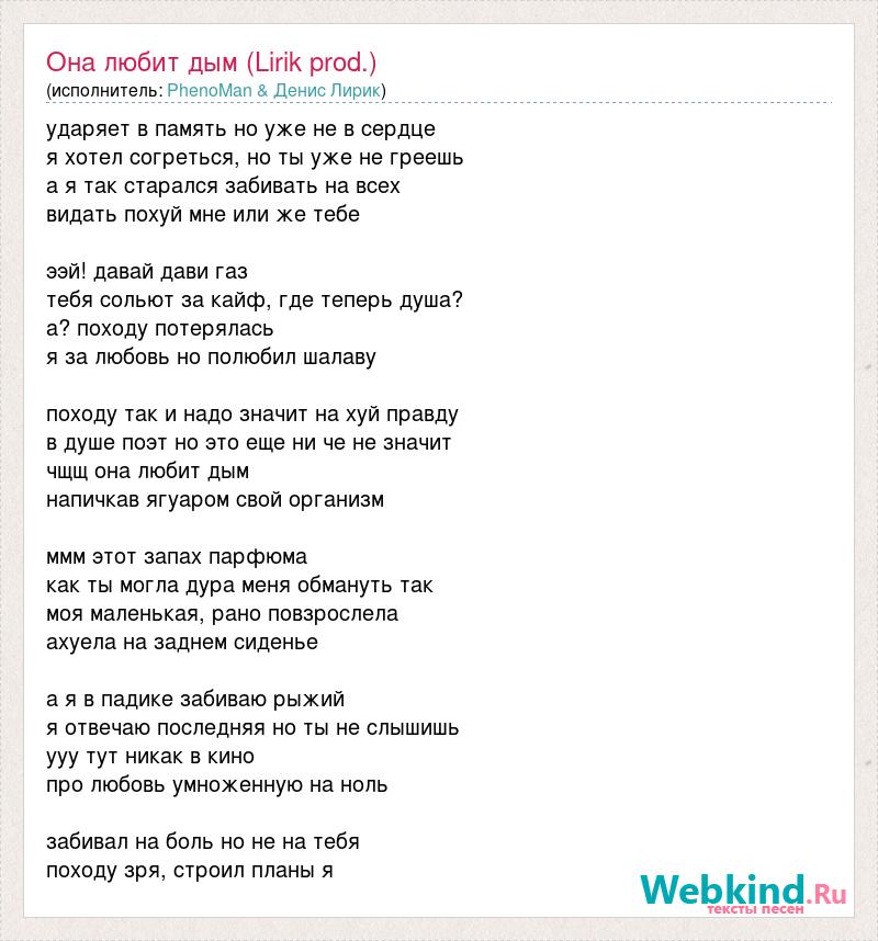 ударяет в память но уже не в сердце я хотел согреться, но ты уже не греешь а я так старался забивать на всех видать похуй мне или же тебе ээй! давай дави газ тебя сольют за кайф, где теперь душа? а? походу потерялась я за любовь но полюбил шалаву походу так и надо значит на хуй правду в душе поэт но это еще ни че не значит чщщ она любит дым напичкав ягуаром свой организм ммм этот запах парфюма как ты могла дура меня обмануть так моя маленькая, рано повзрослела ахуела на заднем сиденье а я в падике забиваю рыжий я отвечаю последняя но ты не слышишь ууу тут никак в кино про любовь умноженную на ноль забивал на боль но не на тебя походу зря, строил планы я