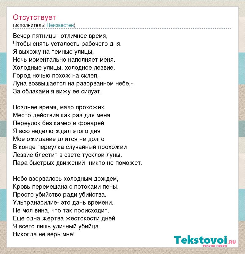 Вечер пятницы- отличное время, Чтобы снять усталость рабочего дня. Я выхожу на темные улицы, Ночь моментально наполняет меня. Холодные улицы, холодное лезвие, Город ночью похож на склеп, Луна возвышается на разорванном небе,- За облаками я вижу ее силуэт. Позднее время, мало прохожих, Место действия как раз для меня Переулок без камер и фонарей Я всю неделю ждал этого дня Мое ожидание длится не долго В конце переулка случайный прохожий Лезвие блестит в свете тусклой луны. Пара быстрых движений- никто не поможет. Небо взорвалось холодным дождем, Кровь перемешана с потоками пены. Просто убийство ради убийства. Ультранасилие- это дань времени. Не моя вина, что так происходит. Еще одна жертва жестокости дней Я всего лишь уличный убийца. Никогда не верь мне!