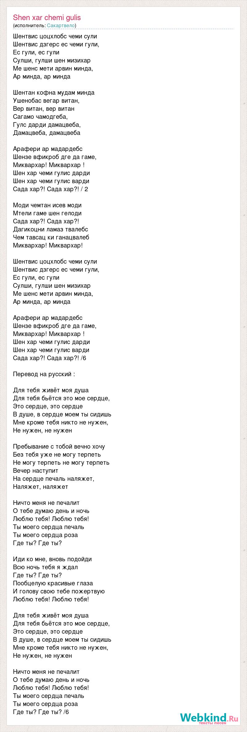 Шентвис цоцхлобс чеми сули Шентвис дзгерс ес чеми гули, Ес гули, ес гули Сулши, гулши шен мизихар Ме шенс мети арвин минда, Ар минда, ар минда Шентан кофна мудам минда Ушенобас вегар витан, Вер витан, вер витан Сагамо чамодгеба, Гулс дарди дамацвеба, Дамацвеба, дамацвеба Арафери ар мадардебс Шензе вфикроб дге да гаме, Миквархар! Миквархар ! Шен хар чеми гулис дарди Шен хар чеми гулис варди Сада хар?! Сада хар?! / 2 Моди чемтан исев моди Мтели гаме шен гелоди Сада хар?! Сада хар?! Дагикоцни ламаз твалебс Чем тавсац ки ганацвалеб Миквархар! Миквархар! Шентвис цоцхлобс чеми сули Шентвис дзгерс ес чеми гули, Ес гули, ес гули Сулши, гулши шен мизихар Ме шенс мети арвин минда, Ар минда, ар минда Арафери ар мадардебс Шензе вфикроб дге да гаме, Миквархар! Миквархар ! Шен хар чеми гулис дарди Шен хар чеми гулис варди Сада хар?! Сада хар?! /6 Перевод на русский : Для тебя живёт моя душа Для тебя бьётся это мое сердце, Это сердце, это сердце В душе, в сердце моем ты сидишь Мне кроме тебя никто не нужен, Не нужен, не нужен Пребывание с тобой вечно хочу Без тебя уже не могу терпеть Не могу терпеть не могу терпеть Вечер наступит На сердце печаль наляжет, Наляжет, наляжет Ничто меня не печалит О тебе думаю день и ночь Люблю тебя! Люблю тебя! Ты моего сердца печаль Ты моего сердца роза Где ты? Где ты? Иди ко мне, вновь подойди Всю ночь тебя я ждал Где ты? Где ты? Пообцелую красивые глаза И голову свою тебе пожертвую Люблю тебя! Люблю тебя! Для тебя живёт моя душа Для тебя бьётся это мое сердце, Это сердце, это сердце В душе, в сердце моем ты сидишь Мне кроме тебя никто не нужен, Не нужен, не нужен Ничто меня не печалит О тебе думаю день и ночь Люблю тебя! Люблю тебя! Ты моего сердца печаль Ты моего сердца роза Где ты? Где ты? /6