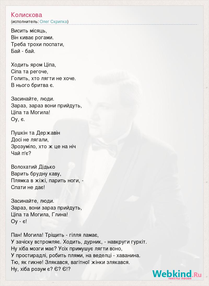 Висить місяць, Він киває рогами. Треба трохи поспати, Бай - бай. Ходить яром Ціпа, Сіпа та регоче, Голить, хто лягти не хоче. В нього бритва є. Засинайте, люди. Зараз, зараз вони прийдуть, Ціпа та Могила! Оу, є. Пушкін та Державін Досі не лягали, Зрозуміло, хто ж це на ніч Чай п'є? Волохатий Дідько Варить брудну каву, Плямка в жіжі, парить ноги, - Спати не дає! Засинайте, люди. Зараз, вони зараз прийдуть, Ціпа та Могила, Глина! Оу - є! Пан! Могила! Тріщить - гілля ламає, У зачіску встромляє. Ходить, дурник, - навкруги гуркіт. Ну хіба мозги має? Усіх примушує лягти воно, У простирадлі, робить плями, на веделці - хаванина. Тю, як гикне! Злякався, вагітної жінки злякався. Ну, хіба розум є? Є? Є!?