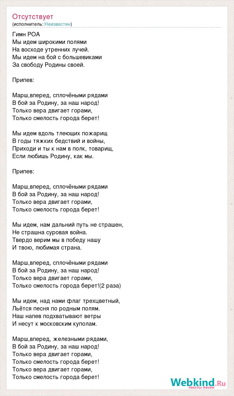 Гимн РОА Мы идем широкими полями На восходе утренних лучей. Мы идем на бой с большевиками За свободу Родины своей. Припев: Марш,вперед, сплочёными рядами В бой за Родину, за наш народ! Только вера двигает горами, Только смелость города берет! Мы идем вдоль тлеющих пожарищ В годы тяжких бедствий и войны, Приходи и ты к нам в полк, товарищ, Если любишь Родину, как мы. Припев: Марш,вперед, сплочёными рядами В бой за Родину, за наш народ! Только вера двигает горами, Только смелость города берет! Мы идем, нам дальний путь не страшен, Не страшна суровая война. Твердо верим мы в победу нашу И твою, любимая страна. Марш,вперед, сплочёными рядами В бой за Родину, за наш народ! Только вера двигает горами, Только смелость города берет!(2 раза) Мы идем, над нами флаг трехцветный, Льётся песня по родным полям. Наш напев подхватывают ветры И несут к московским куполам. Марш,вперед, железными рядами, В бой за Родину, за наш народ! Только вера двигает горами, Только смелость города берет! Только вера двигает горами, Только смелость города берет!