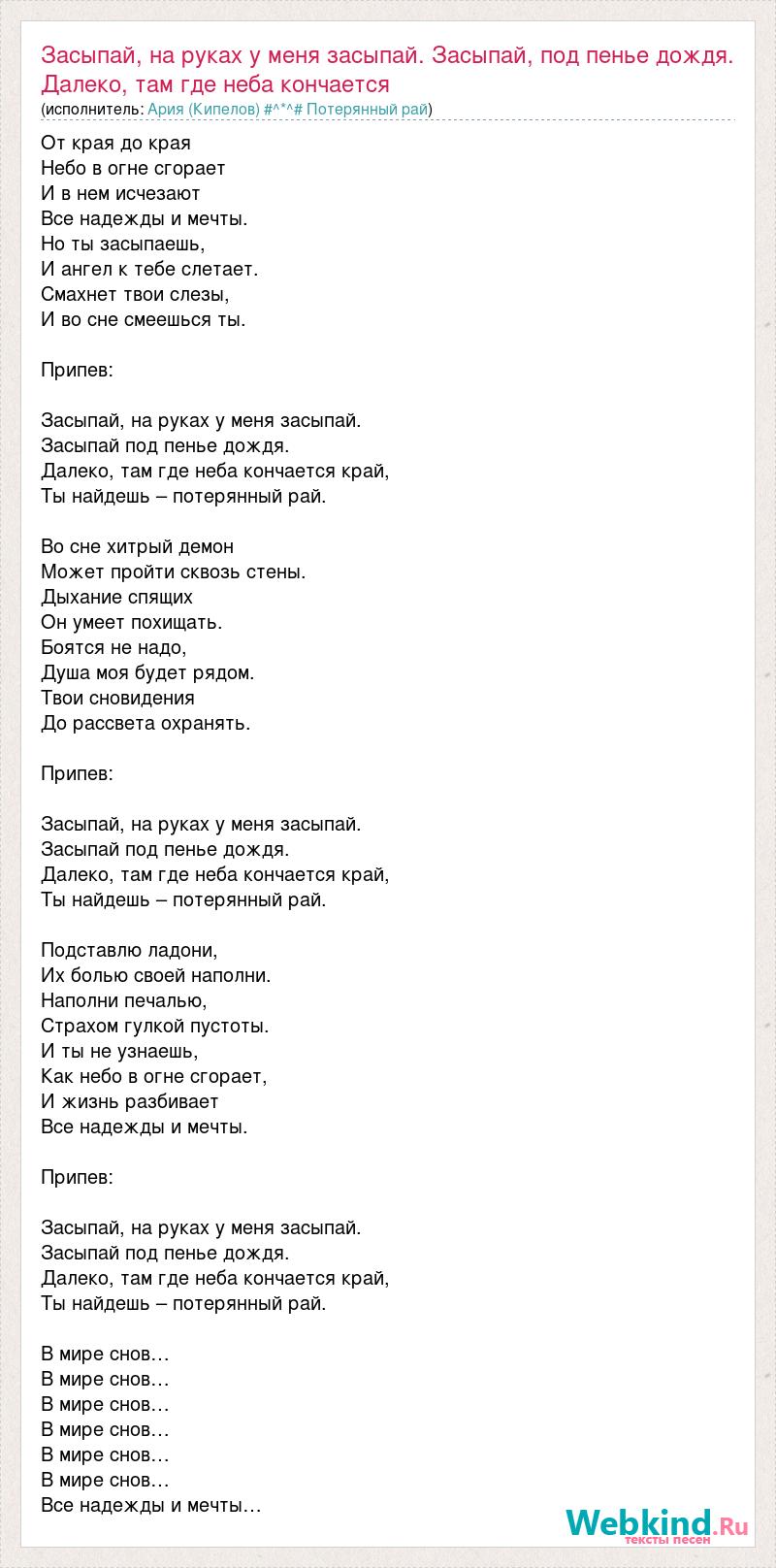 От края до края Небо в огне сгорает И в нем исчезают Все надежды и мечты. Но ты засыпаешь, И ангел к тебе слетает. Смахнет твои слезы, И во сне смеешься ты. Припев: Засыпай, на руках у меня засыпай. Засыпай под пенье дождя. Далеко, там где неба кончается край, Ты найдешь – потерянный рай. Во сне хитрый демон Может пройти сквозь стены. Дыхание спящих Он умеет похищать. Боятся не надо, Душа моя будет рядом. Твои сновидения До рассвета охранять. Припев: Засыпай, на руках у меня засыпай. Засыпай под пенье дождя. Далеко, там где неба кончается край, Ты найдешь – потерянный рай. Подставлю ладони, Их болью своей наполни. Наполни печалью, Страхом гулкой пустоты. И ты не узнаешь, Как небо в огне сгорает, И жизнь разбивает Все надежды и мечты. Припев: Засыпай, на руках у меня засыпай. Засыпай под пенье дождя. Далеко, там где неба кончается край, Ты найдешь – потерянный рай. В мире снов… В мире снов… В мире снов… В мире снов… В мире снов… В мире снов… Все надежды и мечты…