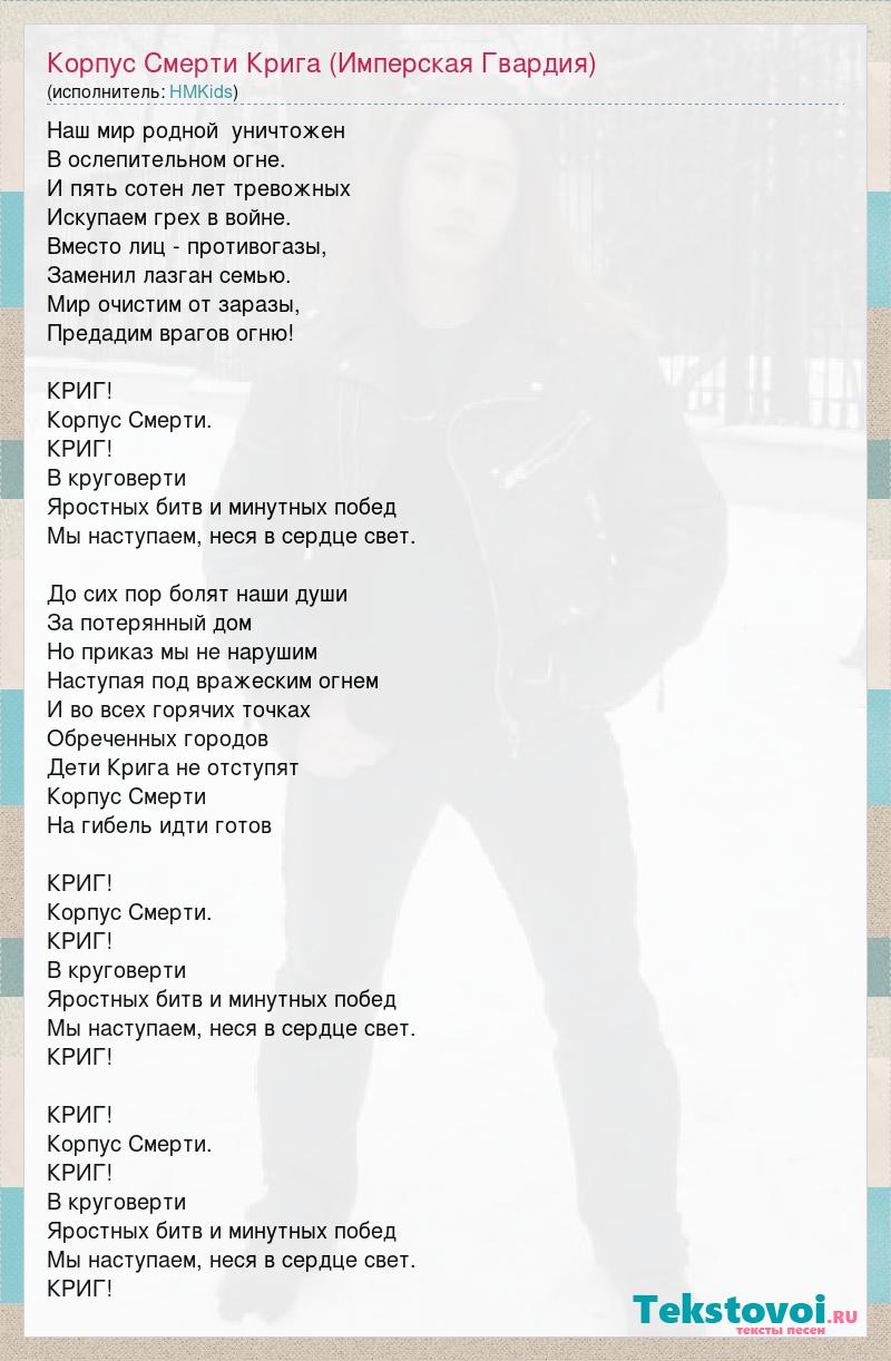 Наш мир родной уничтожен В ослепительном огне. И пять сотен лет тревожных Искупаем грех в войне. Вместо лиц - противогазы, Заменил лазган семью. Мир очистим от заразы, Предадим врагов огню! КРИГ! Корпус Смерти. КРИГ! В круговерти Яростных битв и минутных побед Мы наступаем, неся в сердце свет. До сих пор болят наши души За потерянный дом Но приказ мы не нарушим Наступая под вражеским огнем И во всех горячих точках Обреченных городов Дети Крига не отступят Корпус Смерти На гибель идти готов КРИГ! Корпус Смерти. КРИГ! В круговерти Яростных битв и минутных побед Мы наступаем, неся в сердце свет. КРИГ! КРИГ! Корпус Смерти. КРИГ! В круговерти Яростных битв и минутных побед Мы наступаем, неся в сердце свет. КРИГ!