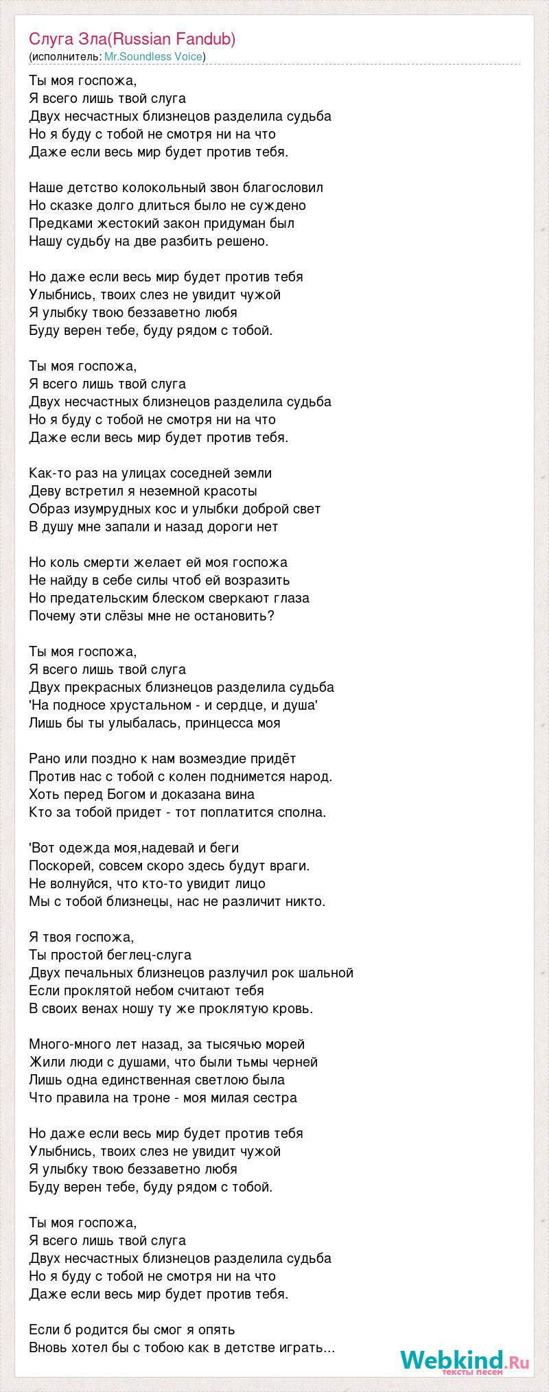 Ты моя госпожа, Я всего лишь твой слуга Двух несчастных близнецов разделила судьба Но я буду с тобой не смотря ни на что Даже если весь мир будет против тебя. Наше детство колокольный звон благословил Но сказке долго длиться было не суждено Предками жестокий закон придуман был Нашу судьбу на две разбить решено. Но даже если весь мир будет против тебя Улыбнись, твоих слез не увидит чужой Я улыбку твою беззаветно любя Буду верен тебе, буду рядом с тобой. Ты моя госпожа, Я всего лишь твой слуга Двух несчастных близнецов разделила судьба Но я буду с тобой не смотря ни на что Даже если весь мир будет против тебя. Как-то раз на улицах соседней земли Деву встретил я неземной красоты Образ изумрудных кос и улыбки доброй свет В душу мне запали и назад дороги нет Но коль смерти желает ей моя госпожа Не найду в себе силы чтоб ей возразить Но предательским блеском сверкают глаза Почему эти слёзы мне не остановить? Ты моя госпожа, Я всего лишь твой слуга Двух прекрасных близнецов разделила судьба 'На подносе хрустальном - и сердце, и душа' Лишь бы ты улыбалась, принцесса моя Рано или поздно к нам возмездие придёт Против нас с тобой с колен поднимется народ. Хоть перед Богом и доказана вина Кто за тобой придет - тот поплатится сполна. 'Вот одежда моя,надевай и беги Поскорей, совсем скоро здесь будут враги. Не волнуйся, что кто-то увидит лицо Мы с тобой близнецы, нас не различит никто. Я твоя госпожа, Ты простой беглец-слуга Двух печальных близнецов разлучил рок шальной Если проклятой небом считают тебя В своих венах ношу ту же проклятую кровь. Много-много лет назад, за тысячью морей Жили люди с душами, что были тьмы черней Лишь одна единственная светлою была Что правила на троне - моя милая сестра Но даже если весь мир будет против тебя Улыбнись, твоих слез не увидит чужой Я улыбку твою беззаветно любя Буду верен тебе, буду рядом с тобой. Ты моя госпожа, Я всего лишь твой слуга Двух несчастных близнецов разделила судьба Но я буду с тобой не смотря ни на что Даже если весь мир будет против тебя. Если б родится бы смог я опять Вновь хотел бы с тобою как в детстве играть...