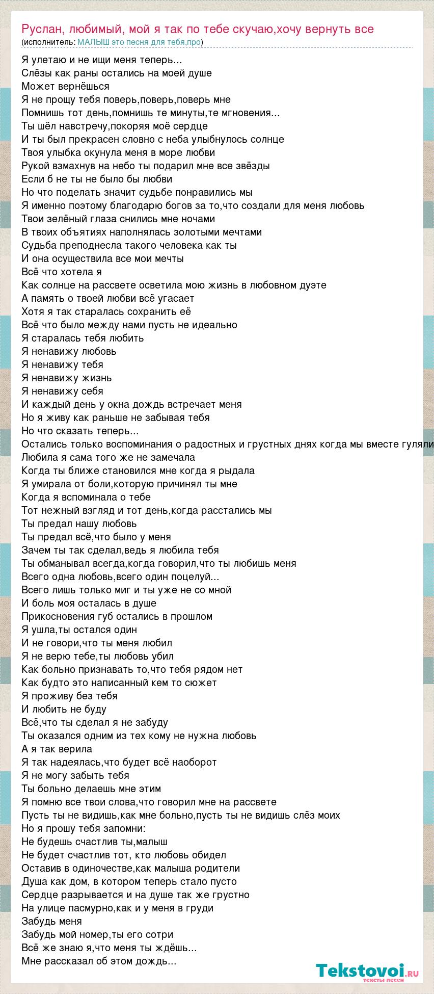 Главная→Исполнители→МАЛЫШ это песня для тебя,про тебя и о тебе!!!я знаю что ты его послушаешь→Руслан, любимый, мой я так по тебе скучаю,хочу вернуть все моменты когда мы были