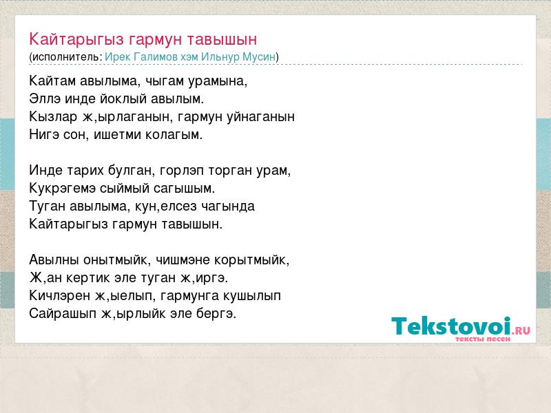 Кайтам авылыма, чыгам урамына, Эллэ инде йоклый авылым. Кызлар ж,ырлаганын, гармун уйнаганын Нигэ сон, ишетми колагым. Инде тарих булган, горлэп торган урам, Кукрэгемэ сыймый сагышым. Туган авылыма, кун,елсез чагында Кайтарыгыз гармун тавышын. Авылны онытмыйк, чишмэне корытмыйк, Ж,ан кертик эле туган ж,иргэ. Кичлэрен ж,ыелып, гармунга кушылып Сайрашып ж,ырлыйк эле бергэ.