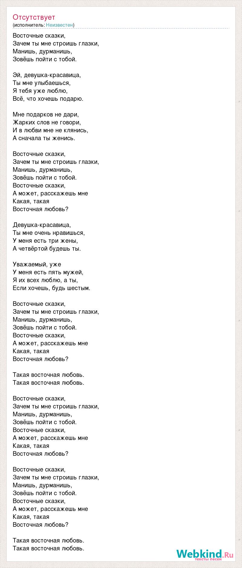 Восточные сказки, Зачем ты мне строишь глазки, Манишь, дурманишь, Зовёшь пойти с тобой. Эй, девушка-красавица, Ты мне улыбаешься, Я тебя уже люблю, Всё, что хочешь подарю. Мне подарков не дари, Жарких слов не говори, И в любви мне не клянись, А сначала ты женись. Восточные сказки, Зачем ты мне строишь глазки, Манишь, дурманишь, Зовёшь пойти с тобой. Восточные сказки, А может, расскажешь мне Какая, такая Восточная любовь? Девушка-красавица, Ты мне очень нравишься, У меня есть три жены, А четвёртой будешь ты. Уважаемый, уже У меня есть пять мужей, Я их всех люблю, а ты, Если хочешь, будь шестым. Восточные сказки, Зачем ты мне строишь глазки, Манишь, дурманишь, Зовёшь пойти с тобой. Восточные сказки, А может, расскажешь мне Какая, такая Восточная любовь? Такая восточная любовь. Такая восточная любовь. Восточные сказки, Зачем ты мне строишь глазки, Манишь, дурманишь, Зовёшь пойти с тобой. Восточные сказки, А может, расскажешь мне Какая, такая Восточная любовь? Восточные сказки, Зачем ты мне строишь глазки, Манишь, дурманишь, Зовёшь пойти с тобой. Восточные сказки, А может, расскажешь мне Какая, такая Восточная любовь? Такая восточная любовь. Такая восточная любовь.