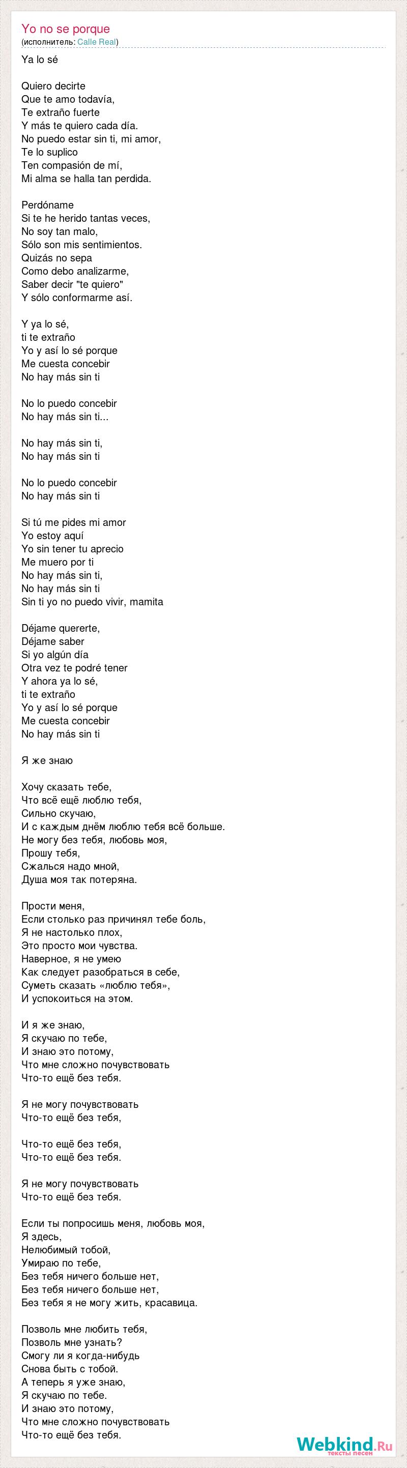 Ya lo sé Quiero decirte Que te amo todavía, Te extraño fuerte Y más te quiero cada día. No puedo estar sin ti, mi amor, Te lo suplico Ten compasión de mí, Mi alma se halla tan perdida. Perdóname Si te he herido tantas veces, No soy tan malo, Sólo son mis sentimientos. Quizás no sepa Como debo analizarme, Saber decir "te quiero" Y sólo conformarme así. Y ya lo sé, ti te extraño Yo y así lo sé porque Me cuesta concebir No hay más sin ti No lo puedo concebir No hay más sin ti... No hay más sin ti, No hay más sin ti No lo puedo concebir No hay más sin ti Si tú me pides mi amor Yo estoy aquí Yo sin tener tu aprecio Me muero por ti No hay más sin ti, No hay más sin ti Sin ti yo no puedo vivir, mamita Déjame quererte, Déjame saber Si yo algún día Otra vez te podré tener Y ahora ya lo sé, ti te extraño Yo y así lo sé porque Me cuesta concebir No hay más sin ti Я же знаю Хочу сказать тебе, Что всё ещё люблю тебя, Сильно скучаю, И с каждым днём люблю тебя всё больше. Не могу без тебя, любовь моя, Прошу тебя, Сжалься надо мной, Душа моя так потеряна. Прости меня, Если столько раз причинял тебе боль, Я не настолько плох, Это просто мои чувства. Наверное, я не умею Как следует разобраться в себе, Суметь сказать «люблю тебя», И успокоиться на этом. И я же знаю, Я скучаю по тебе, И знаю это потому, Что мне сложно почувствовать Что-то ещё без тебя. Я не могу почувствовать Что-то ещё без тебя, Что-то ещё без тебя, Что-то ещё без тебя. Я не могу почувствовать Что-то ещё без тебя. Если ты попросишь меня, любовь моя, Я здесь, Нелюбимый тобой, Умираю по тебе, Без тебя ничего больше нет, Без тебя ничего больше нет, Без тебя я не могу жить, красавица. Позволь мне любить тебя, Позволь мне узнать? Смогу ли я когда-нибудь Снова быть с тобой. А теперь я уже знаю, Я скучаю по тебе. И знаю это потому, Что мне сложно почувствовать Что-то ещё без тебя.