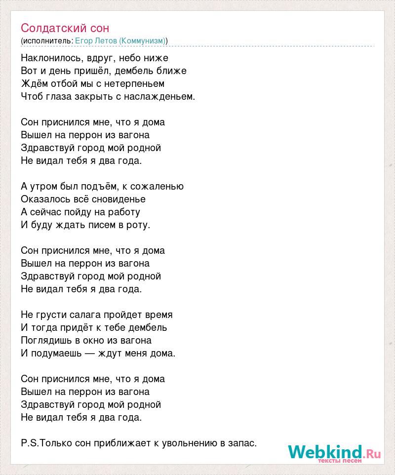 Наклонилось, вдруг, небо ниже Вот и день пришёл, дембель ближе Ждём отбой мы с нетерпеньем Чтоб глаза закрыть с наслажденьем. Сон приснился мне, что я дома Вышел на перрон из вагона Здравствуй город мой родной Не видал тебя я два года. А утром был подъём, к сожаленью Оказалось всё сновиденье А сейчас пойду на работу И буду ждать писем в роту. Сон приснился мне, что я дома Вышел на перрон из вагона Здравствуй город мой родной Не видал тебя я два года. Не грусти салага пройдет время И тогда придёт к тебе дембель Поглядишь в окно из вагона И подумаешь — ждут меня дома. Сон приснился мне, что я дома Вышел на перрон из вагона Здравствуй город мой родной Не видал тебя я два года. P.S.Только сон приближает к увольнению в запас.