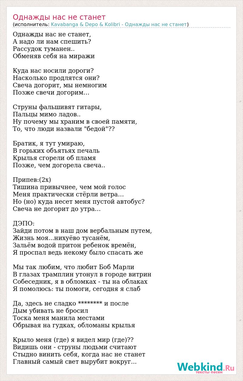 Однажды нас не станет, А надо ли нам спешить? Рассудок туманен.. Обменяв себя на миражи Куда нас носили дороги? Насколько продлятся они? Свеча догорит, мы немногим Позже свечи догорим… Струны фальшивят гитары, Пальцы мимо ладов.. Ну почему мы храним в своей памяти, То, что люди назвали "бедой"?? Братик, я тут умираю, В горьких объятьях печаль Крылья сгорели об пламя Позже, чем догорела свеча.. Припев:(2х) Тишина привычнее, чем мой голос Меня практически стёрли ветра… Но (но) куда несет меня пустой автобус? Свеча не догорит до утра… ДЭПО: Зайди потом в наш дом вербальным путем, Жизнь моя...нихуёво тусанём, Зальём водой притон ребенок времён, Я проспал ведь некому было спасать же Мы так любим, что любит Боб Марли В глазах трамплин утонул в городе витрин Собеседник, я в обломках - ты на облаках Я помолюсь: ты помоги, сегодня я слаб Да, здесь не сладко ******** и после Дым убивать не бросил Тоска меня манила местами Обрывая на гудках, обломаны крылья Крыло меня (где) я видел мир (где)?? Видишь они - струны людьми считают Стыдно винить себя, когда нас не станет Главный самый свет вырубит вокруг...