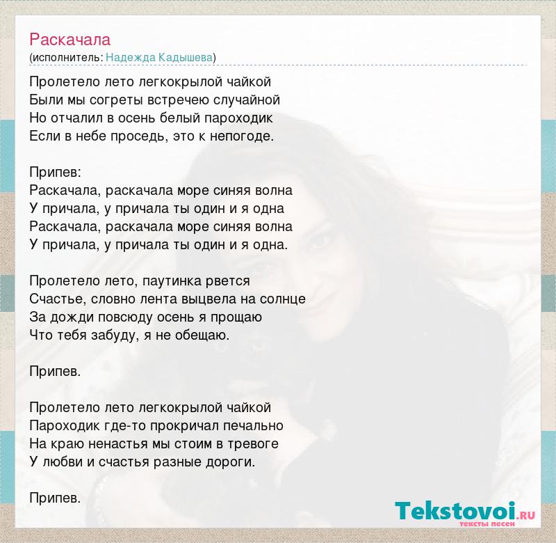 Пролетело лето легкокрылой чайкой Были мы согреты встречею случайной Но отчалил в осень белый пароходик Если в небе проседь, это к непогоде. Припев: Раскачала, раскачала море синяя волна У причала, у причала ты один и я одна Раскачала, раскачала море синяя волна У причала, у причала ты один и я одна. Пролетело лето, паутинка рвется Счастье, словно лента выцвела на солнце За дожди повсюду осень я прощаю Что тебя забуду, я не обещаю. Припев. Пролетело лето легкокрылой чайкой Пароходик где-то прокричал печально На краю ненастья мы стоим в тревоге У любви и счастья разные дороги. Припев.