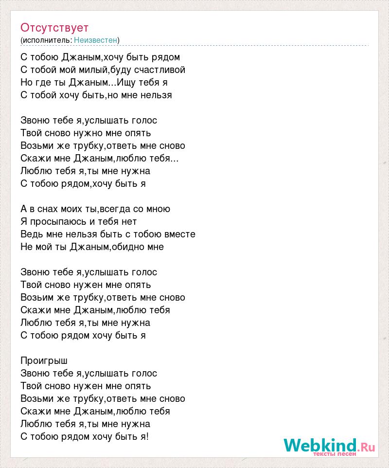 С тобою Джаным,хочу быть рядом С тобой мой милый,буду счастливой Но где ты Джаным...Ищу тебя я С тобой хочу быть,но мне нельзя Звоню тебе я,услышать голос Твой сново нужно мне опять Возьми же трубку,ответь мне сново Скажи мне Джаным,люблю тебя... Люблю тебя я,ты мне нужна С тобою рядом,хочу быть я А в снах моих ты,всегда со мною Я просыпаюсь и тебя нет Ведь мне нельзя быть с тобою вместе Не мой ты Джаным,обидно мне Звоню тебе я,услышать голос Твой сново нужен мне опять Возьим же трубку,ответь мне сново Скажи мне Джаным,люблю тебя Люблю тебя я,ты мне нужна С тобою рядом хочу быть я Проигрыш Звоню тебе я,услышать голос Твой сново нужен мне опять Возьми же трубку,ответь мне сново Скажи мне Джаным,люблю тебя Люблю тебя я,ты мне нужна С тобою рядом хочу быть я!