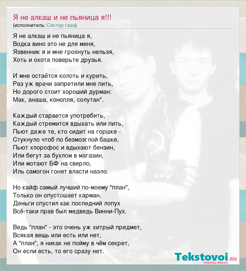 Я не алкаш и не пьяница я, Водка вино это не для меня, Язвенник я и мне грохнуть нельзя, Хоть и охота поверьте друзья. И мне остаётся колоть и курить, Раз уж врачи запретили мне пить, Но дорого стоит хороший дурман: Мак, анаша, конопля, солутан*. Каждый старается употребить, Каждый стремится вдыхать или пить, Пьют даже те, кто сидит на горшке - Стукнуло чтоб по безмозглой башке, Пьют хлорофос и вдыхают бензин, Или бегут за бухлом в магазин, Или мотают БФ на сверло, Иль самогон гонят власти назло. Но кайф самый лучший по-моему "план", Только он опустошает карман, Деньги спустил как последний лопух Всё-таки прав был медведь Винни-Пух. Ведь "план" - это очень уж хитрый предмет, Всякая вещь или есть или нет, А "план", я никак не пойму в чём секрет, Он если есть, то его сразу нет.